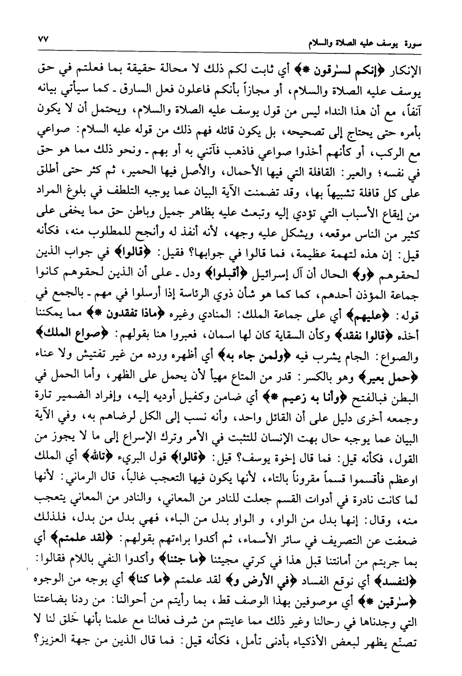 الإنكار ) إنكم لسارقون ) أي ثابت لكم ذلك لا محالة حقيقة بما فعلتم في حق يوسف عليه الصلاة والسلام ، أو مجازاً بأنكم فاعلون فعل السارق - كما سيأتي بيانه آنفاً ، مع أن هذا النداء ليس من قول يوسف عليه الصلاة والسلام ، ويحتمل أن لا يكون بأمره حتى يحتاج إلى تصحيحه ، بل يكون قائله فهم ذلك من قوله عليه السلام : صواعي مع الركب ، أو كأنهم أخذوا صواعي فاذهب فآتني به أو بهم - ونحو ذلك مما هو حق في نفسه ؛ والعير : القافلة التي فيها الأحمال ، والأصل فيها الحمير ، ثم كثر حتى أطلق على كل قافلة تشبيهاً بها ، وقد تضمنت الآية البيان عما يوجبه التلطف في بلوغ المراد من إيقاع الأسباب التي تؤدي إليه وتبعث عليه بظاهر جميل وباطن حق مما يخفى على كثير من الناس موقعه ، ويشكل عليه وجهه ، لأنه أنفذ له وأنجح للمطلوب منه ، فكأنه قيل : إن هذه لتهمة عظيمة ، فما قالوا في جوابها ؟ فقيل : ( قالوا ( في جواب الذين لحقوهم ) و ( الحال أن آل إسرائيل ) أقبلوا ( ودل - على أن الذين لحقوهم كانوا جماعة المؤذن أحدهم ، كما هو شأن ذوي الرئاسة إذا أرسلوا في مهم - بالجمع في قوله : ( عليهم ) أي على جماعة الملك : المنادي وغيره ) ماذا تفقدون ( مما يمكننا أخذه ) قالوا نفقد ( وكأن السقاية كان لها اسمان ، فعبروا هنا بقولهم : ( صواع الملك ( والصواع : الجام يشرب فيه ) ولمن جاء به ) أي أظهره ورده من غير تفتيش ولا عناء ) حمل بعير ( وهو بالكسر : قدر من المتاع مهيأ لأن يحمل على الظهر ، وأما الحمل في البطن فبالفتح ) وأنا به زعيم ) أي ضامن وكفيل أدويه إليه ، وإفراد الضمير تارة وجمعه أخرى دليل على أن القاتل واحد ، وأنه نسب إلى الكل لرضاهم به ، وفي الآية البيان عما يوجبه حال بهت الإنسان للتثبيت في الأمر وترك الإسراع إلى ما لا يجوز من القول ، فكأنه قيل : فما قال إخوة يوسف ؟ قيل : ( قالوا ( قول البريء ) تالله ) أي الملك اوعظم فأقسموا قسماً مقروناً بالتاء ، لأنها يكون فيها التعجب غالباً ، قال الرماني : لأنها لما كانت نادرة في أدوات القسم جعلت للنادر من المعاني ، والنادر من المعاني يتعجب منه ، وقال : إنها بدل من الواو ، والواو بدل من الباء ، فهي بدل من بدل ، فلذلك ضعفت عن التصريف في سائر الأسماء ، ثم أكدوا براءتهم بقولهم : ( لقد علمتم ) أي بما جربتم من أمانتنا قبل هذا في كرتي مجيئنا ) ما جئنا ( وأكدوا النفي باللام فقالوا : ( لنفسد ) أي نوقع الفساد ) وفي الأرض و ( لقد علمتم ) ما كنا ) أي بوجه من الوجوه ) سارقين ) أي موصوفين بهذا الوصف قط ، بما رأيتم من أحوالنا : من ردنا بضاعتنا التي وجدناها في رحالنا وغير ذلك مما عاينتم من شرف فعالنا مع علمنا بأنها خَلق لنا لا تصنّع يظهر لبعض الأذكياء بأدنى تأمل ، فكأنه قيل : فما قال الذين من جهة العزيز ؟