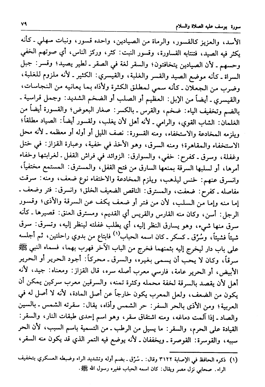 الأسد ، والعزيز كالقسور ، والرماة من الصيادين ، واحده قسور ، ونبات سهلي - كأنه يكثر فيه الصيد ، فتنتابه القساورة ، وقسور النبت : كثر ، وركز الناس ، أي صوتهم الخفي وحسهم - لأن الصيادين يتخافتون ؛ والسقر لغة في الصقر - لطير يصيد ؛ وقسر : جبل السراة - كأنه موضع الصيد والقسر والغلبة ، والقيسري : الكثير - لأنه ملزوم من النجاسات ، والقيسري - أيضاً من الإبل : العظيم أو الصلب أو الضخم الشديد : وجمل قراسية - بالضم وتخفيف الياء : ضخم ، والقرس - بالكسر : صغار البعوض ؛ والقسورة أيضاً من الغلمان : الشاب القوي ، والرامي - لأنه أهل لأن يغلب ، والقسور أيضاً : الصياد مطلقاً ؛ ويلزمه المخادعة والاستخفاء ، ومنه القسورة : نصف الليل أو أوله أو معظمه - لأنه محل الاستخفاء والمقاهرة ؛ ومنه السرق ، وهوالأخذ في خفية ، وعبارة القزاز : في ختل وغفلة ، وسرق - كفرح : خفي ، والسوارق : الزوائد في فراش القفل - لغرابتها وخفاء أمرها ، أو لسلبها السرقة بمنعها السارق من فتح القفل ، والمسترق : المستمع مختفياً ، وانسرق عنهم : خنس ليذهب ، ويلزم المخادعة والاختفاء نوع ضعف ، ومنه : سرقت مفاصله - كفرح : ضعفت ، والمسترق : الناقص الضعيف الخلق ؛ وانسرق : فتر وضعف - إما منه وإما من السلب ، لأن من فتر أو ضعف يكف عن السرقة والأذى ؛ وقسور الرجل : أسن ، وكان منه القارس والقريس أي القديم ، ومسترق العنق : قصيرها - كأنه سرق منها شيء ، وهو يسارق النظر إليه ، أي يطلب غفلته لينظر إليه ، وتسرق : سرق شيئاً فشيئاً ، وسُرَّق - كسكر - كان اسمه الحباب فابتاع من بدوي راحلتين ، ثم أجلسه على باب دار ليخرج إليه بثمنهما فخرج من الباب الآخر فهرب بهما ، فسماه النبي ( صلى الله عليه وسلم ) سرقاً ، وكان لا يحب أن يسمى بغيره ، والسرق - محركاً : أجود الحرير أو الحرير الأبيض ، أو الحرير عامة ، فارسي معرب أصله سره ، قال القزاز : ومعناه : جيد ، لأنه أهل لأن يقصد بالسرقة لخفة محملة وكثرة تمنه ، والسرقين معرب سركين يمكن أن يكون من الضعف ، ولعل المعرب يكون خارجاً عن أصل المادة ، لأنه لا أصل له في العربية ؛ ومن الاذى بالحر السفر : حر الشمس وأذاه ، يقال : سقرته الشمس - بالسين والصاد - إذا آلمت دماغه ، ومنه اشتقاق سقر ، وهو اسم إحدى طبقات النار ، والسقر : القيادة على الحرم ، والسقر : ما يسيل من الرطب - من التسمية باسم السبب ، لأن الحر سببه ، والقوسرة : القوصرة - ويخففان - لأنه يوضع فيه التمر الذي قد يكون من السقر ،
