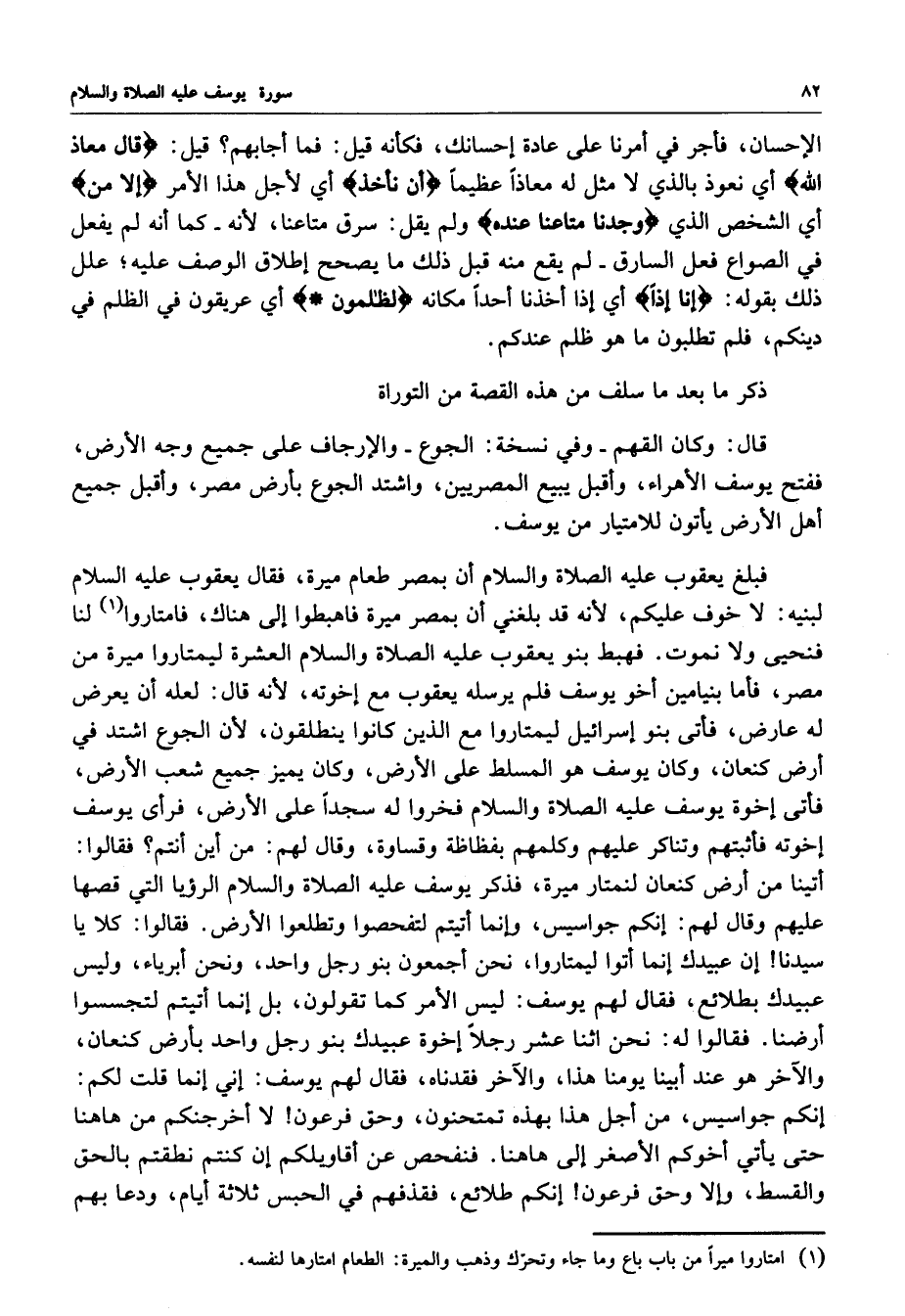 فقالوا : كلا يا سيدنا إن عبيدك إنما أتوا ليمتاروا ، نحن أجمعون بنو رجل واحد ، ونحن أبرياء ، وليس عبيدك بطلائع ، فقال لهم يوسف : ليس الأمر كما تقولون ، بل إنما أتيتم لتجسسوا أرضناز فقالوا له : نحن اثنا عشر رجلاً إخوة عبيدك بنو رجل واحد بأرض كنعان ، والآخر هو عند أبينا يومنا هذا ، والآخر فقدناه ، فقال لهم يوسف : إني إنما قلت لكم : إنكم جواسيس ، من أجل هذا بهذه تمتحنون ، وحق فرعون لا أخرجنكم من هاهنا حتى يأتي أخوكم الأصغر إلى هاهنا .