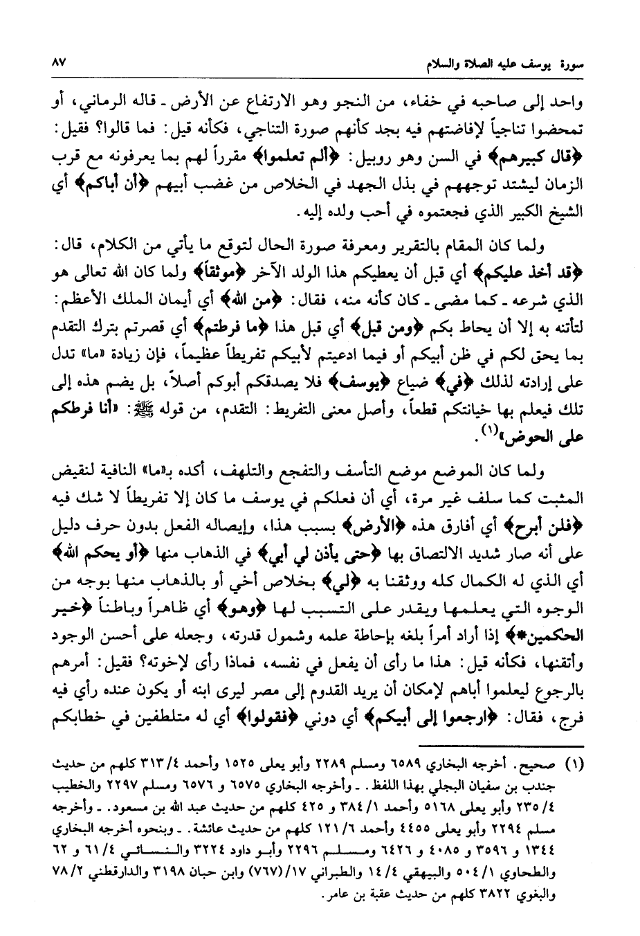 ولما كان المقام بالتقرير ومعرفة صورة الحال لتوقع ما يأتي من الكلام ، قال : ( قد اخذ عليكم ) أي قبل أن يعطيكم هذا الولد الآخر ) موثقاً ( ولما كان الله تعالى هو الذي شرعه - كما مضى - كان كأنه منه ، فقال : ( من الله ) أي إيمان الملك الأعظم : لتأتنه به إلا أن يحاط بكم ) ومن قبل ) أي قبل هذا ) ما فرطتم ) أي قصرتم بترك التقدم بما يحق لكم في ظن أبيكم أو فيما ادعيتم لأبيكم تفريطاً عظيماً ، فإن زيادة ( ما ) تدل على إرادته لذلك ) في ( ضياع ) يوسف ( فلا يصدقكم أبوكم أصلاً ، بل يضم هذه إلى تلك فيعلم بها خيانتكم قطعاً ، وأصل معنى التفريط ، : التقدم ، من قوله ( صلى الله عليه وسلم ) : ( أنا فرطكم على الحوض ) ولما كان الموضع موضع التأسف والتفجع والتلهف ، أكده ب ( ما ) النافية لنقيض المثبت كما سلف غير مرة ، أي أن فعلكم في يوسف ما كان إلا تفريطاً لا شك فيه ) فلن أبرح ) أي أفارق هذه ) الأرض ( بسبب هذا ، وإيصاله الفعل بدون حرف دليل على أنه صار شديد الالتصاق بها ) حتى يأذن لي أبي ( في الذهاب منها ) أو يحكم الله ) أي الذي له الكمال كله ووثقنا به ) لي ( بخلاص أخي أو بالذهاب منها بوجه من الوجوه التي يعلمها ويقدر على التسبب لها ) وهو ) أي ظاهراً وباطناً ) خير الحاكمين ( إذا أراد أمراً بلغه بإحاطة علمه وشمول قدرته ، وجعله على أحسن الوجود وأتقنها ، فكأنه قيل : هذا ما رأى أن يفعل في نفسه ، فماذا رأى لإخوته ؟ فقيل : أمرهم بالرجوع ليعلموا أباهم لإمكان أن يريد القدوم إلى مصر ليرى ابنه أو يكون عنده رأي فيه فرج ، فقال : ( ارجعوا إلى أبيكم ) أي دوني ) فقولوا ) أي له متلطفين في خطابكم