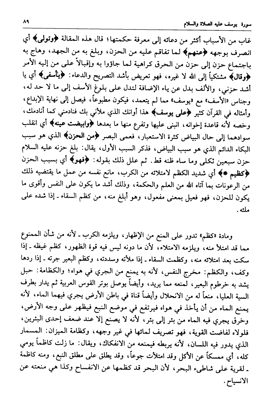 غاب من الاسباب أكثر من دعائه إلى معرفة حكمتها ؛ قال هذه المقالة ) وتولى ) أي انصرف بوجهه ) عنهم ( لما تفاقم عليه من الحزن ، وبلغ به من الجهد ، وهاج به باجتماع حزن إلى حزن من الحرق كراهية لما جاؤوا به وإقبالاً على من إليه الأمر ) وقال ( مشتكياً إلى الله لا غيره ، فهو تعريض بأشد التصريح والدعاء : ( ياأسفي ) أي يا أشد حزني ، والألف بدل عن ياء الإضافة لتدل على بلوغ الأسف إلى ما لا حد له ، وجناس ( الأسف ) مع ( يوسف ) مما لم يتعمدن فيكون مطبوعاً ، فيصل إلى نهاية الإبداع ، وأمثاله في القرآن كثير ) على يوسف ( هذا أوانك الذي ملأني بك فنادني كما أنادمك ، وخصه لأنه قاعدة إخوانه ، انبى عليها وتفرع منها ما بعدها ) وابيضت عينه ) أي انقلب سوادهما إلى حال البياض كثرة الاستعبار ، فعمى البصر ) من الحزن ( الذي هو سبب البكاء الدائم الذي هو سبب البياض ، فذكر السبب الأولن يقال : بلغ حزنه عليه السلام حزن سبعين ثكلى وما ساء طنه قط .