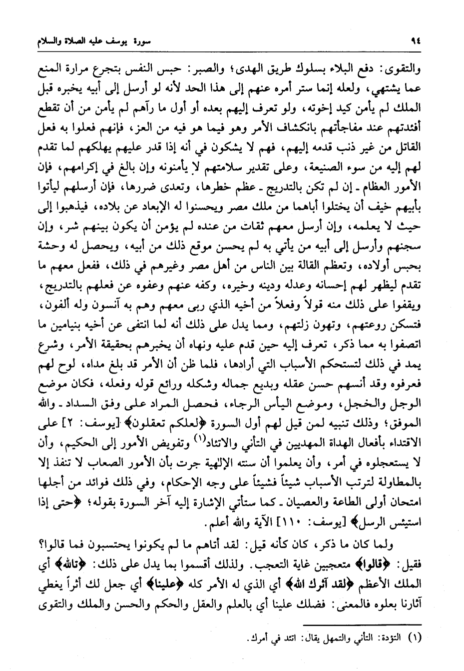 [ يوسف : 2 ] على الاقتداء بأفعال الهداة المهديين في التأني والاتئاد وتفويض الأمور إلى الحكيم ، وأن لا يستعجلوه في أمر ، وأن يعلموا أن سنته الإلهية جرت بأن الأمور الصعاب لا تنفذ إلا بالمطاولة لترتب الأسباب شيئاً فشيئاً على وجه الإحكام ، وفي ذلك فوائد من أجلها امتحان أولى الطاعة والعصيان - كما ستأتي الإشارة إليه آخر السورة بقوله ؛