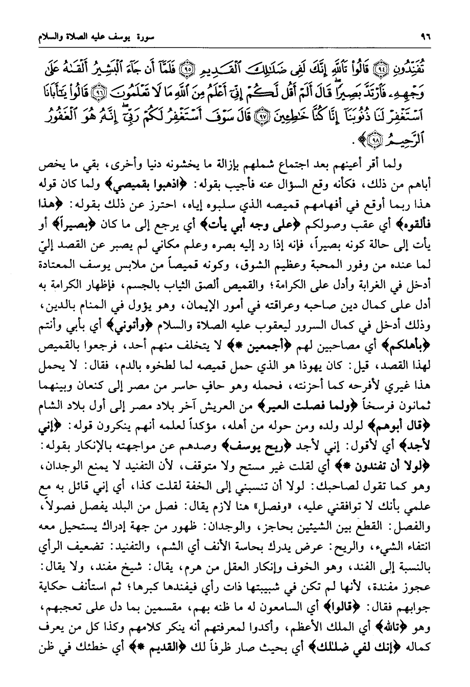 ولما أقر أعينهم بعد اجتماع شملهم بإزالة ما يخشونه دنيا وأخرى ، بقي ما يخص أباهم من ذلك ، فكأنه وقع السؤال عنه فأجيب بقوله : ( اذهبوا بقميصي ( ولما كان قوله هذا ربما أوقع في أفهامهم قميصه الذي سلبوه إياه ، احترز عن ذلك بقوله : ( هذا فألقوه ) أي عقب وصولكم ) على وجه أبي يأت ) أي يرجع إلى ما كان ) بصيراً ( أو يأت إلى حالة كونه بصيراً ، فإنه إذا رد إليه بصره وعلم مكاني لم يصبر عن القصد اليّ لما عنده من وفور المحبة وعظيم الشوق ، وكونه قميصاً من ملابس يوسف المعتادة أدخل في الغرابة وأدل على الكرامة ؛ والقميص ألصق الثياب بالجسم ، فإظهار الكرامة به أدل على كمال دين صاحبه وعراقته في أمور الإيمان ، وهو يؤول في المنام بالدين ، وذلك أدخل في كمال السرور ليعقوب عليه الصلاة والسلام ) وأتوني ) أي بأبي وأنتم ) بأهلكم ) أي مصاحبين لهم ) أجمعين ( لا يتخلف منهم أحد ، فرجعوا بالقميص لهذا القصد ، قيل : كان يهوذا هو الذي حمل قميصه لما لطخوه بالدم ، فقال : لا يحمل هذا غيري لأفرحه كما أحزنته ، فحمله وهو حافٍ حاسر من مصر إلى كنعان وبينهما ثمانون فرسخاً ) ولما فصلت العير ( من العريش آخر بلاد مصر إلى بلاد الشام ) قال أبوهم ( لولد ولده ومن حوله من أهله ، مؤكداً لعلمه أنهم ينكرون قوله : ( إني لأجد ) أي لأقول : إني لأجد ) ريح يوسف ( وصدهم عن مواجهته بالإنكار بقوله : ( لولا أن تفندون ) أي لقلت غير مستح ولا متوقف ، لأن التنفيذ لا يمنع الوجدان ، وهو كما تقول لصاحبك : لولا أن تنسبني إلى الخفة لقلت كذا ، أي إني قائل به مع علمي بأنك لا توافقني عليه ، ( وفصل ) هنا لازم يقال : فصل من البلد يفصل فصولاً ، والفصل : القطع بين الشيئين بحاجز ، والوجدان : ظهور من جهة إدراك يستحيل معه انتفاء الشيء ، والريح : عرض يدرك بحاسة الأنف أي الشم ، والتنفيذ : تضعيف الرأي بالنسبة إلى الفند ، وهو الخوف وإنكار العقل من هرم ، يقال : شيخ مفند ، ولا يقال : عجوز مفندة ، لأنها لم تكن في شبيبتها ذات رأي فيفندها كبرها ؛ ثم استأنف حكاية جوابهم فقال : ( قالوا ) أي السامعون له ما ظنه بهم ، مقسمين بما دل على تعجبهم ، وهو ) تالله ) أي الملك الأعظم ، وأكدوا لمعرفتهم أنه ينكر كلامهم وكذا كل من يعرف كماله ) إنك لفي ضلالك ) أي بحيث صار ظرفاً لك ) القديم ) أي خطئك في ظن