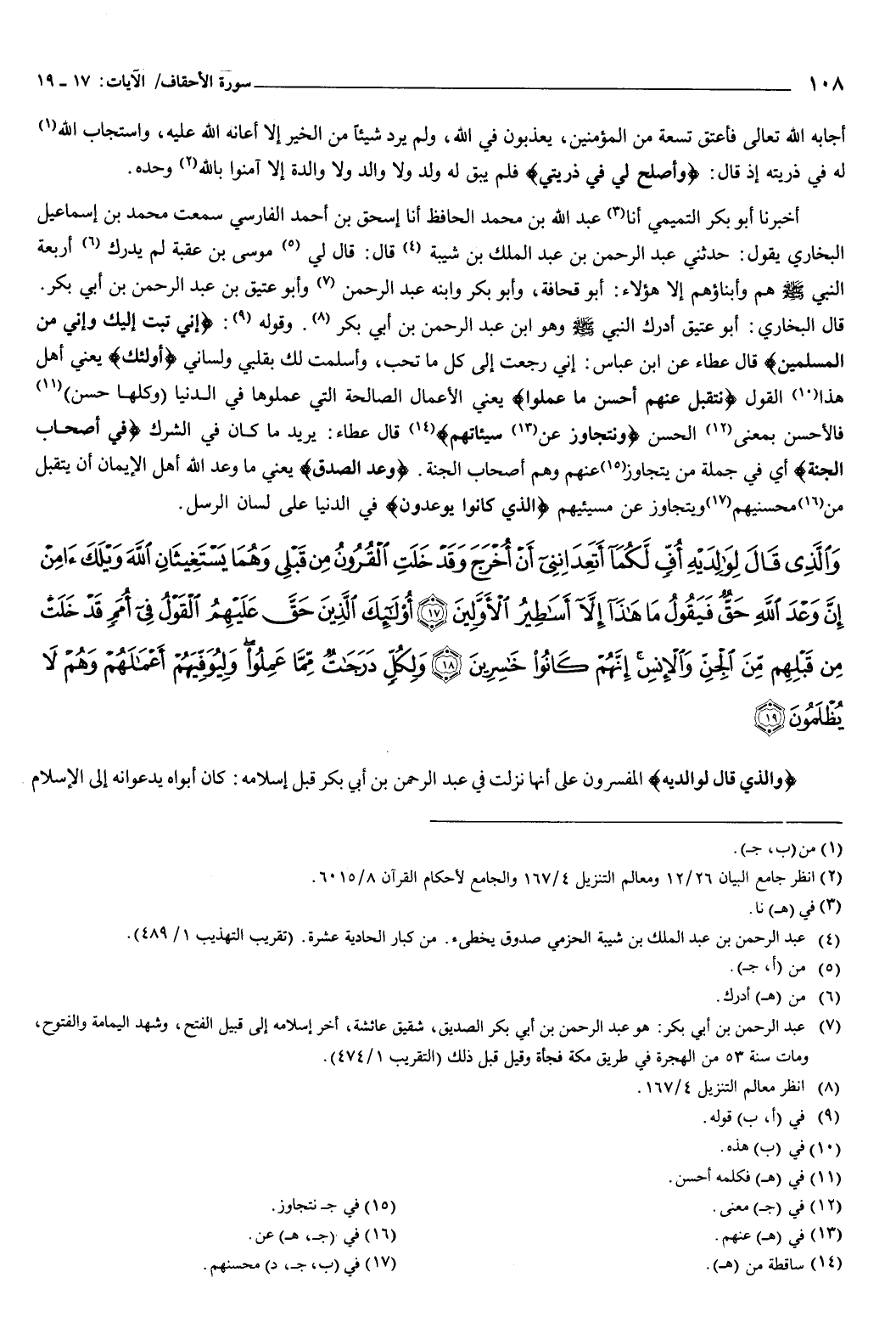 {وَالَّذِي قَالَ لِوَالِدَيْهِ} [الأحقاف: 17] المفسرون على أنها نزلت في عبد الرحمن بن أبي بكر قبل إسلامه، كان أبواه يدعوانه إلى الإسلام