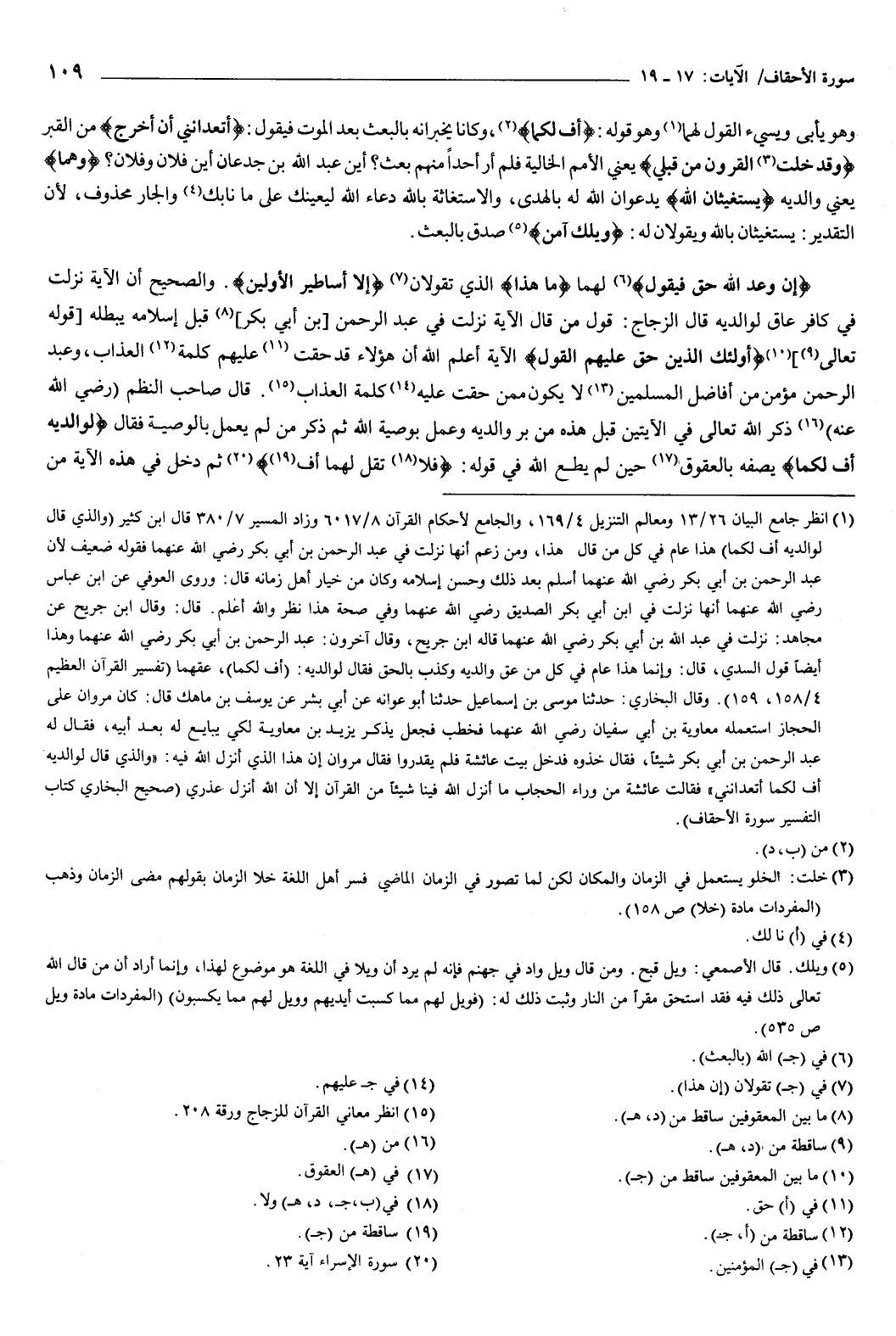 {إِنَّ وَعْدَ اللَّهِ حَقٌّ فَيَقُولُ} [الأحقاف: 17] لهما، ما هذا الذي تقولان، {إِلا أَسَاطِيرُ الأَوَّلِينَ} [الأحقاف: 17] ، والصحيح: أن الآية نزلت في كافر عاق لوالديه، قال الزجاج: قول من قال الآية نزلت في عبد الرحمن بن أبي بكر قبل إسلامه، يبطله قوله تعالى: {أُولَئِكَ الَّذِينَ حَقَّ عَلَيْهِمُ الْقَوْلُ} [الأحقاف: 18] الآية، أعلم الله أن هؤلاء قد حقت عليهم كلمة العذاب، وعبد الرحمن مؤمن من أفاضل المسلمين، لا يكون ممن حقت عليه كلمة العذاب.