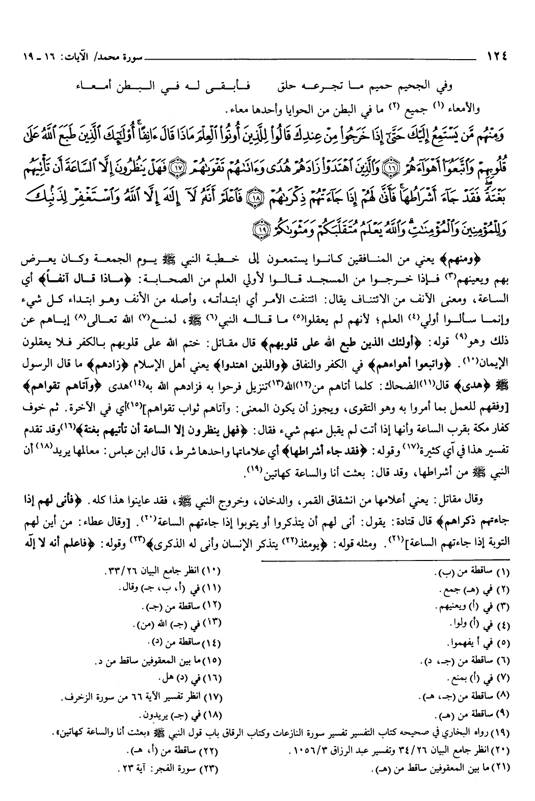 {وَمِنْهُمْ مَنْ يَسْتَمِعُ إِلَيْكَ حَتَّى إِذَا خَرَجُوا مِنْ عِنْدِكَ قَالُوا لِلَّذِينَ أُوتُوا الْعِلْمَ مَاذَا قَالَ آنِفًا أُولَئِكَ الَّذِينَ طَبَعَ اللَّهُ عَلَى قُلُوبِهِمْ وَاتَّبَعُوا أَهْوَاءَهُمْ {16} وَالَّذِينَ اهْتَدَوْا زَادَهُمْ هُدًى وَآتَاهُمْ تَقْوَاهُمْ {17} فَهَلْ يَنْظُرُونَ إِلا السَّاعَةَ أَنْ تَأْتِيَهُمْ بَغْتَةً فَقَدْ جَاءَ أَشْرَاطُهَا فَأَنَّى لَهُمْ إِذَا جَاءَتْهُمْ ذِكْرَاهُمْ {18} فَاعْلَمْ أَنَّهُ لا إِلَهَ إِلا اللَّهُ وَاسْتَغْفِرْ لِذَنْبِكَ وَلِلْمُؤْمِنِينَ وَالْمُؤْمِنَاتِ وَاللَّهُ يَعْلَمُ مُتَقَلَّبَكُمْ وَمَثْوَاكُمْ {19} } [محمد: 16-19] .