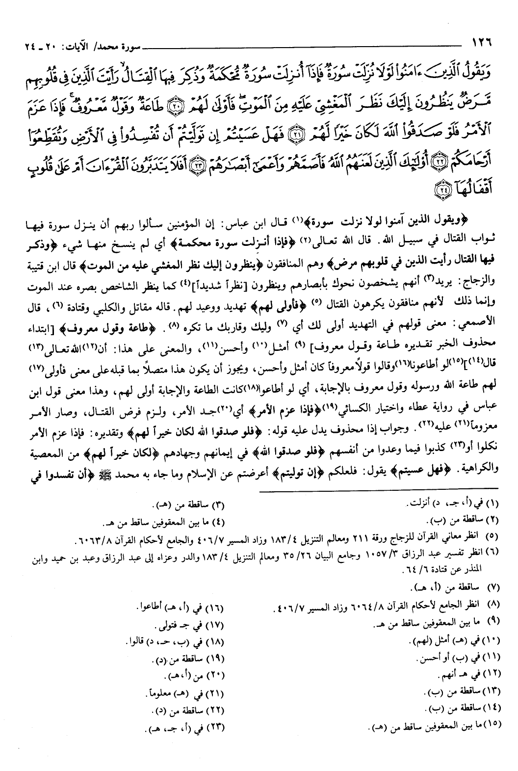 {وَيَقُولُ الَّذِينَ آمَنُوا لَوْلا نُزِّلَتْ سُورَةٌ فَإِذَا أُنْزِلَتْ سُورَةٌ مُحْكَمَةٌ وَذُكِرَ فِيهَا الْقِتَالُ رَأَيْتَ الَّذِينَ فِي قُلُوبِهِمْ مَرَضٌ يَنْظُرُونَ إِلَيْكَ نَظَرَ الْمَغْشِيِّ عَلَيْهِ مِنَ الْمَوْتِ فَأَوْلَى لَهُمْ {20} طَاعَةٌ وَقَوْلٌ مَعْرُوفٌ فَإِذَا عَزَمَ الأَمْرُ فَلَوْ صَدَقُوا اللَّهَ لَكَانَ خَيْرًا لَهُمْ {21} فَهَلْ عَسَيْتُمْ إِنْ تَوَلَّيْتُمْ أَنْ تُفْسِدُوا فِي الأَرْضِ وَتُقَطِّعُوا أَرْحَامَكُمْ {22} أُولَئِكَ الَّذِينَ لَعَنَهُمُ اللَّهُ فَأَصَمَّهُمْ وَأَعْمَى أَبْصَارَهُمْ {23} أَفَلا يَتَدَبَّرُونَ الْقُرْءَانَ أَمْ عَلَى قُلُوبٍ أَقْفَالُهَا {24} } [محمد: 20-24] .