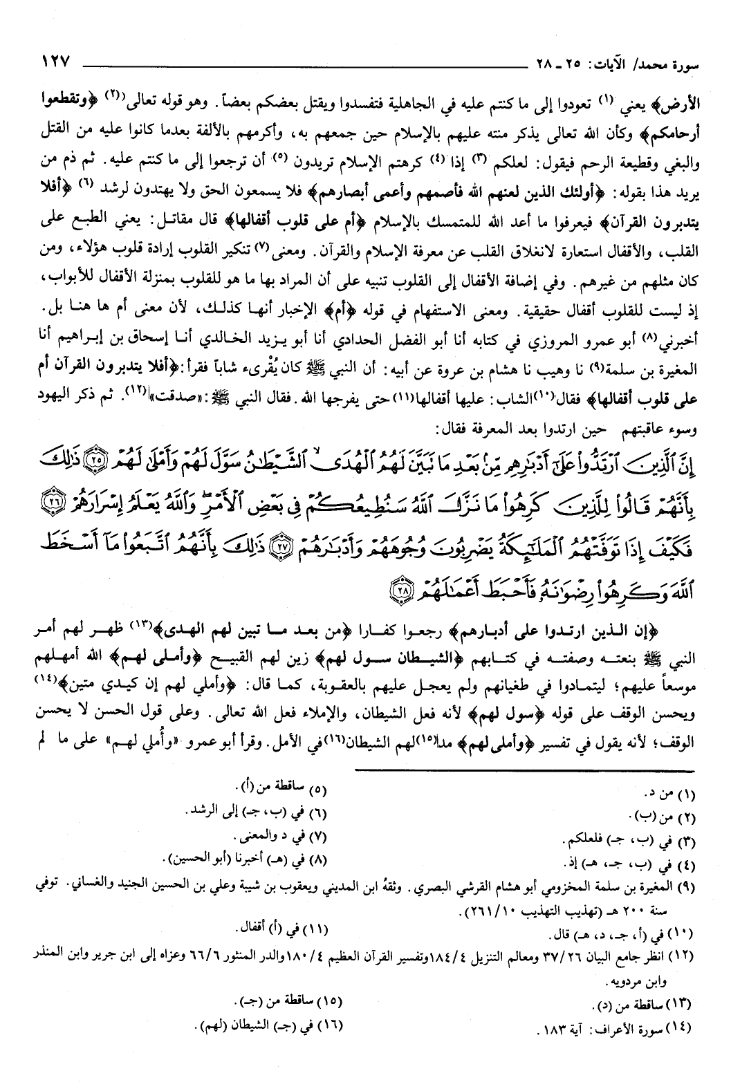 {إِنَّ الَّذِينَ ارْتَدُّوا عَلَى أَدْبَارِهِمْ} [محمد: 25] رجعوا كفارا، {مِنْ بَعْدِ مَا تَبَيَّنَ لَهُمُ الْهُدَى} [محمد: 25] ظهر لهم أمر النبي صَلَّى اللهُ عَلَيْهِ وَسَلَّمَ بنعته، وصفته في كتابهم، {الشَّيْطَانُ سَوَّلَ لَهُمْ} [محمد: 25] زين لهم القبيح، وأملى لهم الله أمهلهم موسعًا عليهم، ليتمادوا في طغيانهم، ولم يعجل عليهم بالعقوبة، كما قال: {وَأُمْلِي لَهُمْ إِنَّ كَيْدِي مَتِينٌ} [الأعراف: 183] ويحسن الوقف على قوله: {سَوَّلَ لَهُمْ} [محمد: 25] لأنه فعل الشيطان، والإملاء فعل الله تعالى.