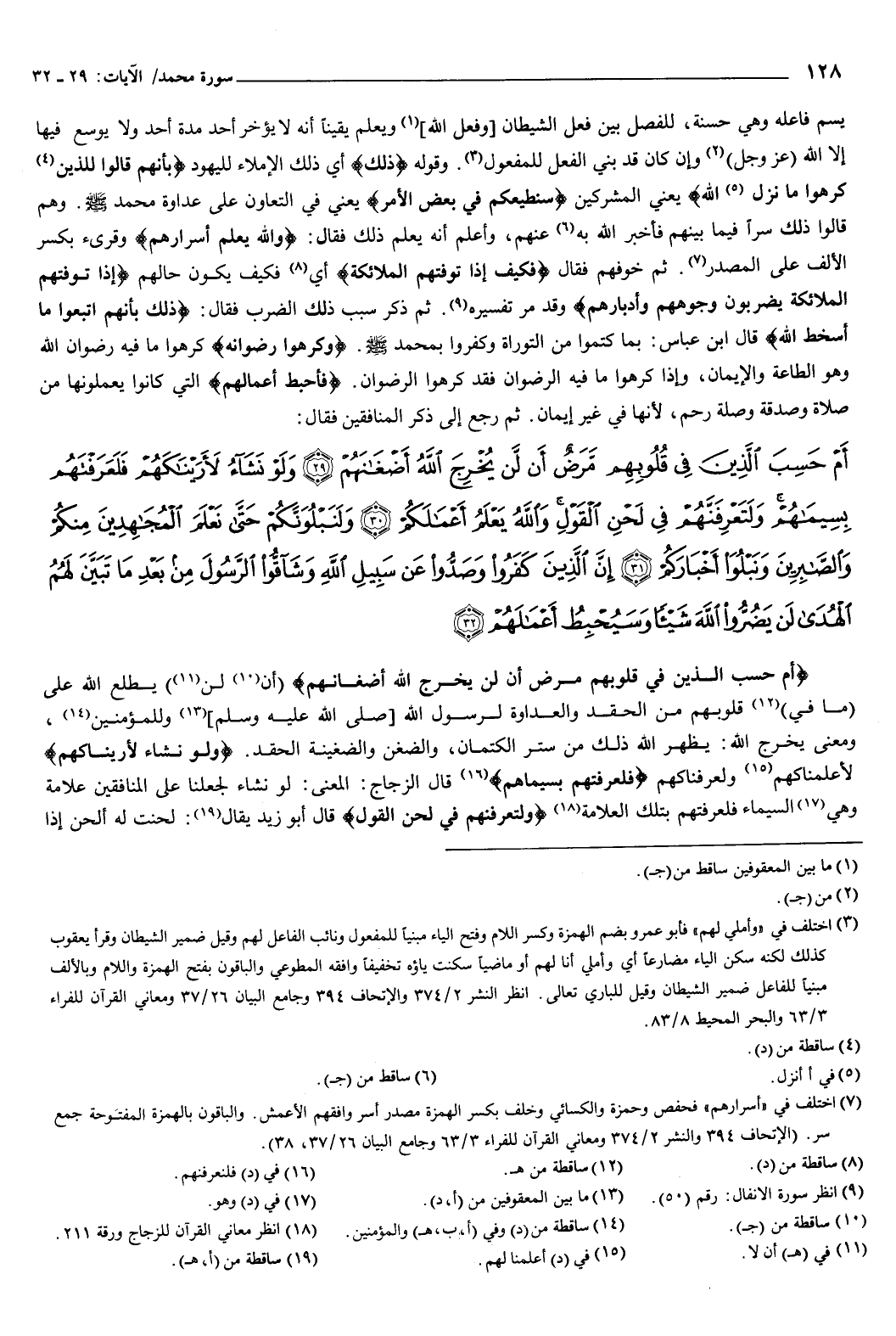 ثم رجع إلى ذكر المنافقين، فقال: {أَمْ حَسِبَ الَّذِينَ فِي قُلُوبِهِمْ مَرَضٌ أَنْ لَنْ يُخْرِجَ اللَّهُ أَضْغَانَهُمْ {29} وَلَوْ نَشَاءُ لأَرَيْنَاكَهُمْ فَلَعَرَفْتَهُمْ بِسِيمَاهُمْ وَلَتَعْرِفَنَّهُمْ فِي لَحْنِ الْقَوْلِ وَاللَّهُ يَعْلَمُ أَعْمَالَكُمْ {30} وَلَنَبْلُوَنَّكُمْ حَتَّى نَعْلَمَ الْمُجَاهِدِينَ مِنْكُمْ وَالصَّابِرِينَ وَنَبْلُوَ أَخْبَارَكُمْ {31} إِنَّ الَّذِينَ كَفَرُوا وَصَدُّوا عَنْ سَبِيلِ اللَّهِ وَشَاقُّوا الرَّسُولَ مِنْ بَعْدِ مَا تَبَيَّنَ لَهُمُ الْهُدَى لَنْ يَضُرُّوا اللَّهَ شَيْئًا وَسَيُحْبِطُ أَعْمَالَهُمْ {32} } [محمد: 29-32] .