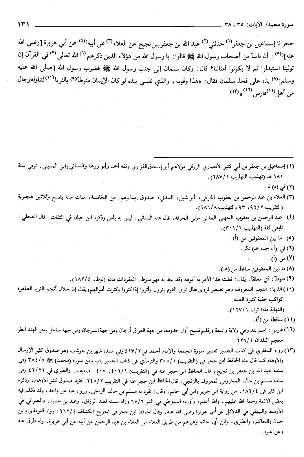 حُجْرٍ، أنا إِسْمَاعِيلُ بْنُ جَعْفَرٍ، حَدَّثَنِي عَبْدُ اللَّهِ بْنُ جَعْفَرِ بْنِ نَجِيحٍ، عَنِ الْعَلاءِ، عَنْ أَبِيهِ، عَنْ أَبِي هُرَيْرَةَ رَضِيَ اللَّهُ عَنْهُ: أَنَّ نَاسًا مِنْ أَصْحَابِ رَسُولِ اللَّهِ صَلَّى اللهُ عَلَيْهِ وَسَلَّمَ قَالُوا: يَا رَسُولَ اللَّهِ، مَنْ هَؤُلاءِ الَّذِينَ ذَكَرَهُمُ اللَّهُ تَعَالَى فِي الْقُرْآنِ إِنْ تَوَلَّيْنَا اسْتُبْدِلُوا ثُمَّ لا يَكُونُوا أَمْثَالَنَا؟ قَالَ: وَكَانَ سَلْمَانُ إِلَى جَنْبِ رَسُولِ اللَّهِ صَلَّى اللهُ عَلَيْهِ وَسَلَّمَ فَضَرَبَ رَسُولُ اللَّهِ صَلَّى اللهُ عَلَيْهِ وَسَلَّمَ يَدَهُ عَلَى فَخِذِ سَلْمَانَ، فَقَالَ: «هَذَا وَقَوْمُهُ، وَالَّذِي نَفْسِي بِيَدِهِ لَوْ كَانَ الْإِيمَانُ مَنُوطًا بِالثُّرَيَّا لَتَنَاوَلَهُ رِجَالٌ مِنْ أَهْلِ فَارِسَ» .