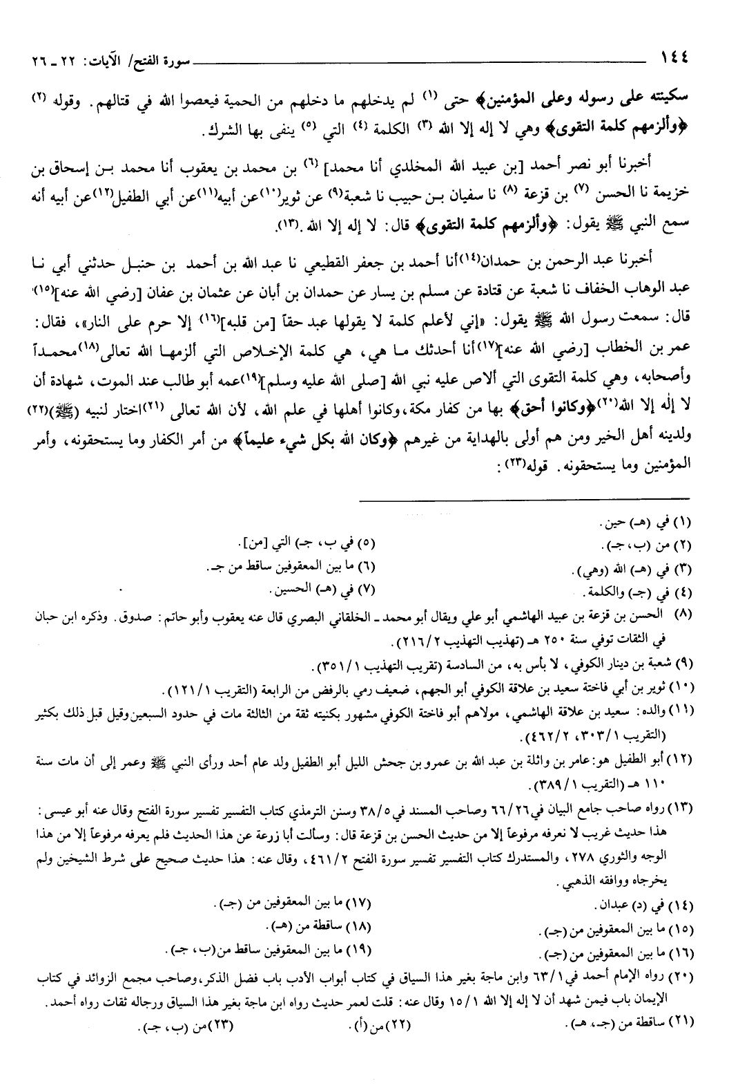 854 - أَخْبَرَنَا أَبُو نَصْرٍ أَحْمَدُ بْنُ عُبَيْدِ اللَّهِ الْمَخْلَدِيُّ، أنا مُحَمَّدُ بْنُ مُحَمَّدِ بْنِ يَعْقُوبَ، أنا مُحَمَّد بْنُ إِسْحَاقَ بْنِ خُزَيْمَةَ، نا الْحَسَنُ بْنُ قَزَعَةَ، نا سُفْيَانُ بْنُ حَبِيبٍ، نا شُعْبَةُ، عَنْ ثُوَيْرٍ، عَنْ أَبِيهِ، عَنْ أَبِي الطُّفَيْلِ، عَنْ أَبِيهِ، أَنَّهُ سَمِعَ النَّبِيَّ صَلَّى اللهُ عَلَيْهِ وَسَلَّمَ يَقُولُ: {وَأَلْزَمَهُمْ كَلِمَةَ التَّقْوَى} [الفتح: 26] قَالَ: لا إِلَهَ إِلا اللَّهُ.