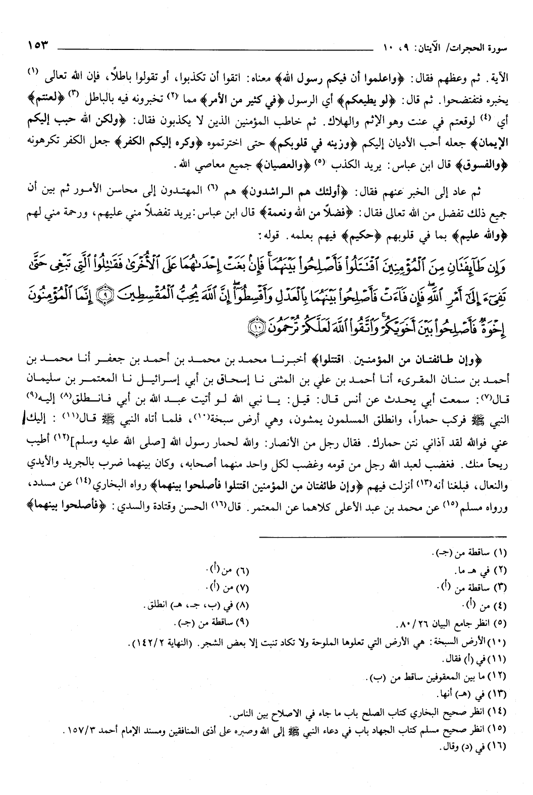 قوله: {وَإِنْ طَائِفَتَانِ مِنَ الْمُؤْمِنِينَ اقْتَتَلُوا فَأَصْلِحُوا بَيْنَهُمَا فَإِنْ بَغَتْ إِحْدَاهُمَا عَلَى الأُخْرَى فَقَاتِلُوا الَّتِي تَبْغِي حَتَّى تَفِيءَ إِلَى أَمْرِ اللَّهِ فَإِنْ فَاءَتْ فَأَصْلِحُوا بَيْنَهُمَا بِالْعَدْلِ وَأَقْسِطُوا إِنَّ اللَّهَ يُحِبُّ الْمُقْسِطِينَ {9} إِنَّمَا الْمُؤْمِنُونَ إِخْوَةٌ فَأَصْلِحُوا بَيْنَ أَخَوَيْكُمْ وَاتَّقُوا اللَّهَ لَعَلَّكُمْ تُرْحَمُونَ {10} } [الحجرات: 9-10] .