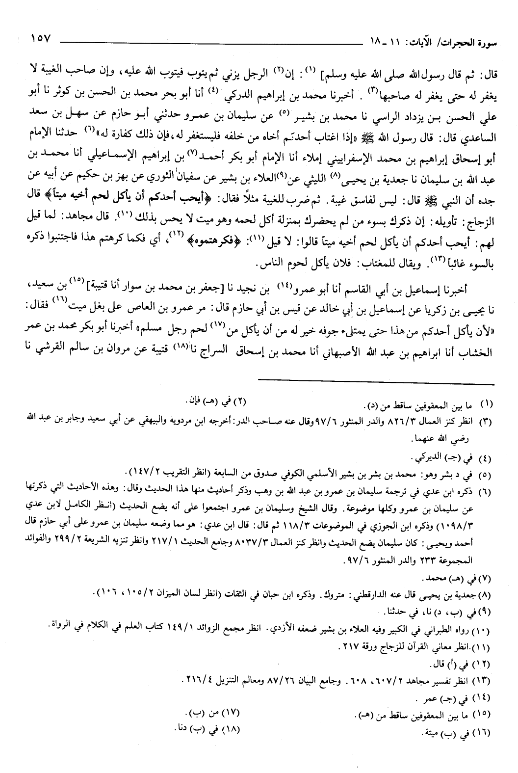 ثم ضرب للغيبة مثلًا، فقال: {أَيُحِبُّ أَحَدُكُمْ أَنْ يَأْكُلَ لَحْمَ أَخِيهِ مَيْتًا} [الحجرات: 12] قال الزجاج: تأويله: إن ذكرك بسوء من لم يحضرك، بمنزلة أكل لحمه وهو ميت لا يحس بذلك.