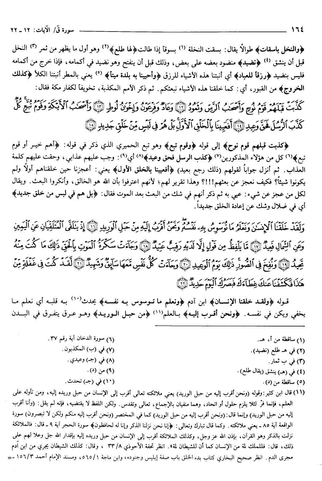 {وَلَقَدْ خَلَقْنَا الإِنْسَانَ وَنَعْلَمُ مَا تُوَسْوِسُ بِهِ نَفْسُهُ وَنَحْنُ أَقْرَبُ إِلَيْهِ مِنْ حَبْلِ الْوَرِيدِ {16} إِذْ يَتَلَقَّى الْمُتَلَقِّيَانِ عَنِ الْيَمِينِ وَعَنِ الشِّمَالِ قَعِيدٌ {17} مَا يَلْفِظُ مِنْ قَوْلٍ إِلا لَدَيْهِ رَقِيبٌ عَتِيدٌ {18} وَجَاءَتْ سَكْرَةُ الْمَوْتِ بِالْحَقِّ ذَلِكَ مَا كُنْتَ مِنْهُ تَحِيدُ {19} وَنُفِخَ فِي الصُّورِ ذَلِكَ يَوْمُ الْوَعِيدِ {20} وَجَاءَتْ كُلُّ نَفْسٍ مَعَهَا سَائِقٌ وَشَهِيدٌ {21} لَقَدْ كُنْتَ فِي غَفْلَةٍ مِنْ هَذَا فَكَشَفْنَا عَنْكَ غِطَاءَكَ فَبَصَرُكَ الْيَوْمَ حَدِيدٌ {22} } [ق: 16-22] .