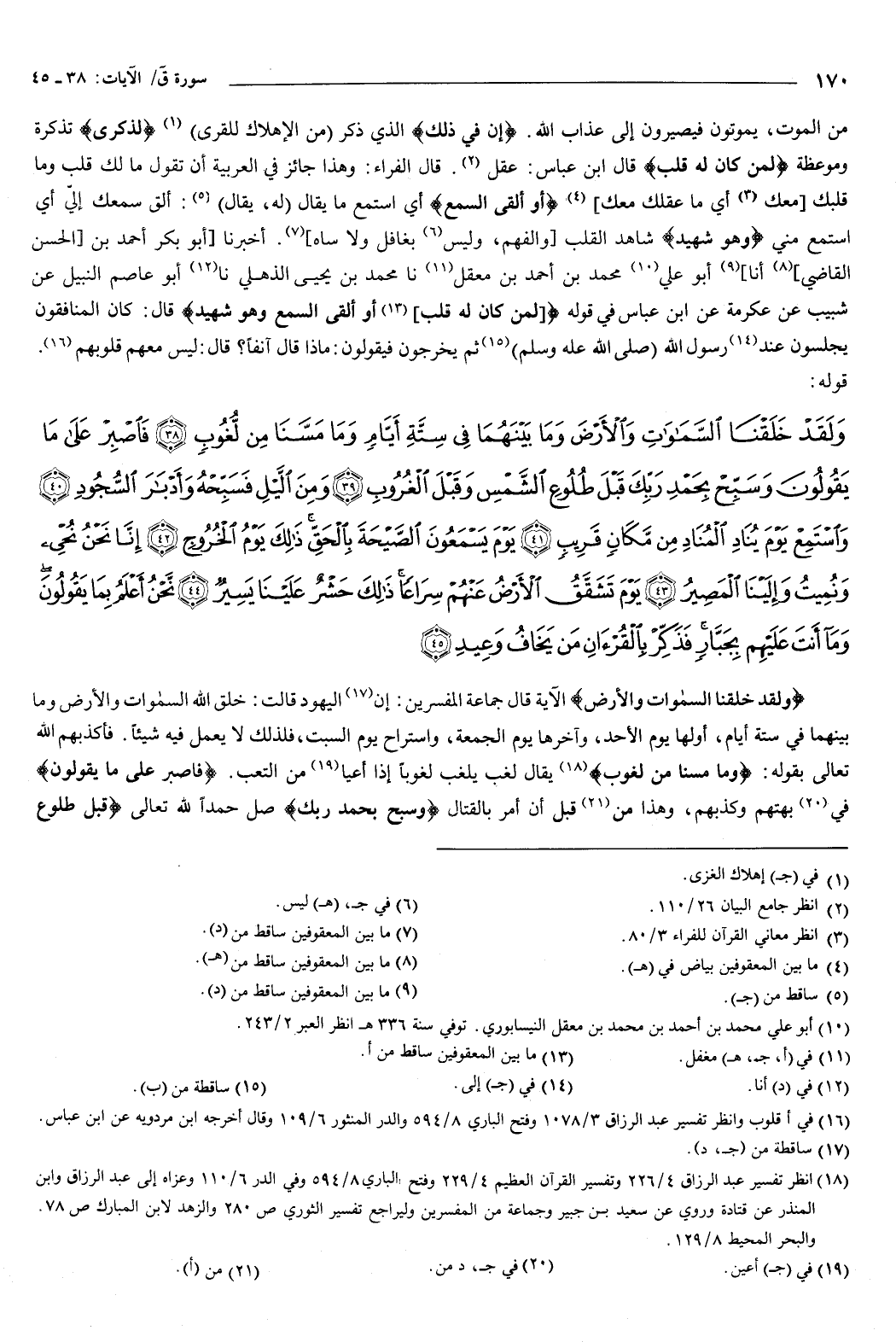 قوله: {وَلَقَدْ خَلَقْنَا السَّمَوَاتِ وَالأَرْضَ وَمَا بَيْنَهُمَا فِي سِتَّةِ أَيَّامٍ وَمَا مَسَّنَا مِنْ لُغُوبٍ {38} فَاصْبِرْ عَلَى مَا يَقُولُونَ وَسَبِّحْ بِحَمْدِ رَبِّكَ قَبْلَ طُلُوعِ الشَّمْسِ وَقَبْلَ الْغُرُوبِ {39} وَمِنَ اللَّيْلِ فَسَبِّحْهُ وَأَدْبَارَ السُّجُودِ {40} وَاسْتَمِعْ يَوْمَ يُنَادِ الْمُنَادِ مِنْ مَكَانٍ قَرِيبٍ {41} يَوْمَ يَسْمَعُونَ الصَّيْحَةَ بِالْحَقِّ ذَلِكَ يَوْمُ الْخُرُوجِ {42} إِنَّا نَحْنُ نُحْيِي وَنُمِيتُ وَإِلَيْنَا الْمَصِيرُ {43} يَوْمَ تَشَقَّقُ الأَرْضُ عَنْهُمْ سِرَاعًا ذَلِكَ حَشْرٌ عَلَيْنَا يَسِيرٌ {44} نَحْنُ أَعْلَمُ بِمَا يَقُولُونَ وَمَا أَنْتَ عَلَيْهِمْ بِجَبَّارٍ فَذَكِّرْ بِالْقُرْءَانِ مَنْ يَخَافُ وَعِيدِ {45} } [ق: 38-45] .