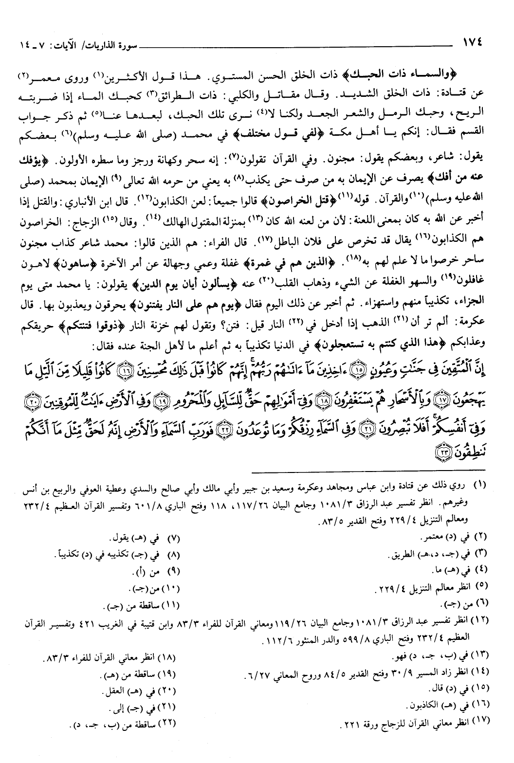 {وَالسَّمَاءِ ذَاتِ الْحُبُكِ} [الذاريات: 7] ذات الخلق الحسن المستوي، هذا قول الأكثرين، وروى معمر، عن قتادة: ذات الخلق الشديد.