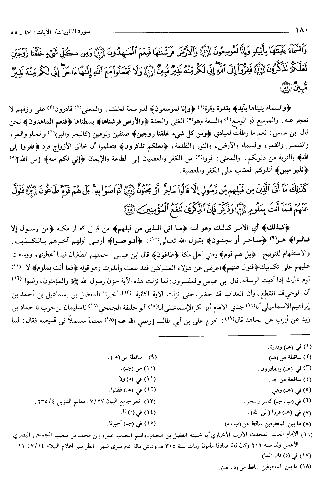 {وَالسَّمَاءَ بَنَيْنَاهَا بِأَيْدٍ} [الذاريات: 47] بقدرة وقوة، {وَإِنَّا لَمُوسِعُونَ} [الذاريات: 47] لذو سعة لخلقنا، والمعنى: قادرون على رزقهم، لا نعجز عنه، والموسع ذو الوسع والسعة، وهو: الغنى والجدة.
