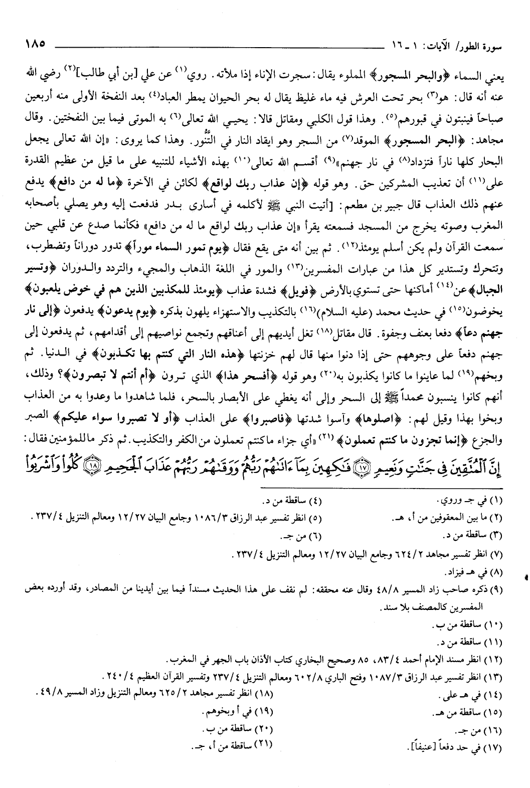 والبحر المسجور المملوء، يقال: سجرت الإناء إذا ملأته، روي عن علي بن أبي طالب، رضي الله عنه، أنه قال: هو بحر تحت العرش، فيه ماء غليظ، يقال له: بحر الحيوان، يمطر العباد بعد النفخة الأولى منه أربعين صباحًا، فينبتون في قبورهم.