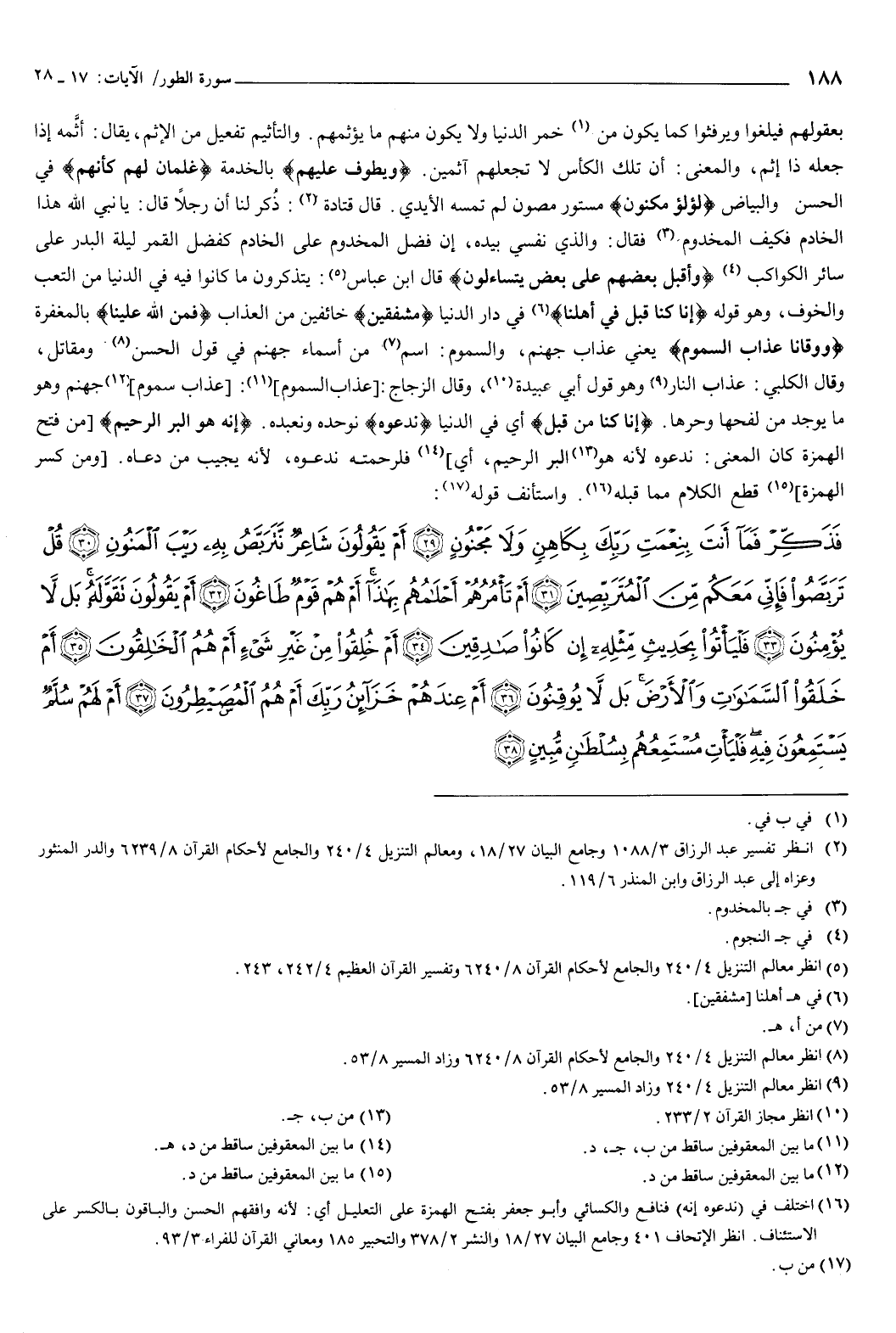 واستأنف قوله: {فَذَكِّرْ فَمَا أَنْتَ بِنِعْمَتِ رَبِّكَ بِكَاهِنٍ وَلا مَجْنُونٍ {29} أَمْ يَقُولُونَ شَاعِرٌ نَتَرَبَّصُ بِهِ رَيْبَ الْمَنُونِ {30} قُلْ تَرَبَّصُوا فَإِنِّي مَعَكُمْ مِنَ الْمُتَرَبِّصِينَ {31} أَمْ تَأْمُرُهُمْ أَحْلامُهُمْ بِهَذَا أَمْ هُمْ قَوْمٌ طَاغُونَ {32} أَمْ يَقُولُونَ تَقَوَّلَهُ بَلْ لا يُؤْمِنُونَ {33} فَلْيَأْتُوا بِحَدِيثٍ مِثْلِهِ إِنْ كَانُوا صَادِقِينَ {34} أَمْ خُلِقُوا مِنْ غَيْرِ شَيْءٍ أَمْ هُمُ الْخَالِقُونَ {35} أَمْ خَلَقُوا السَّمَوَاتِ وَالأَرْضَ بَلْ لا يُوقِنُونَ {36} أَمْ عِنْدَهُمْ خَزَائِنُ رَبِّكَ أَمْ هُمُ الْمُسَيْطِرُونَ {37} أَمْ لَهُمْ سُلَّمٌ يَسْتَمِعُونَ فِيهِ فَلْيَأْتِ مُسْتَمِعُهُمْ بِسُلْطَانٍ مُبِينٍ {38} } [الطور: 29-38] .