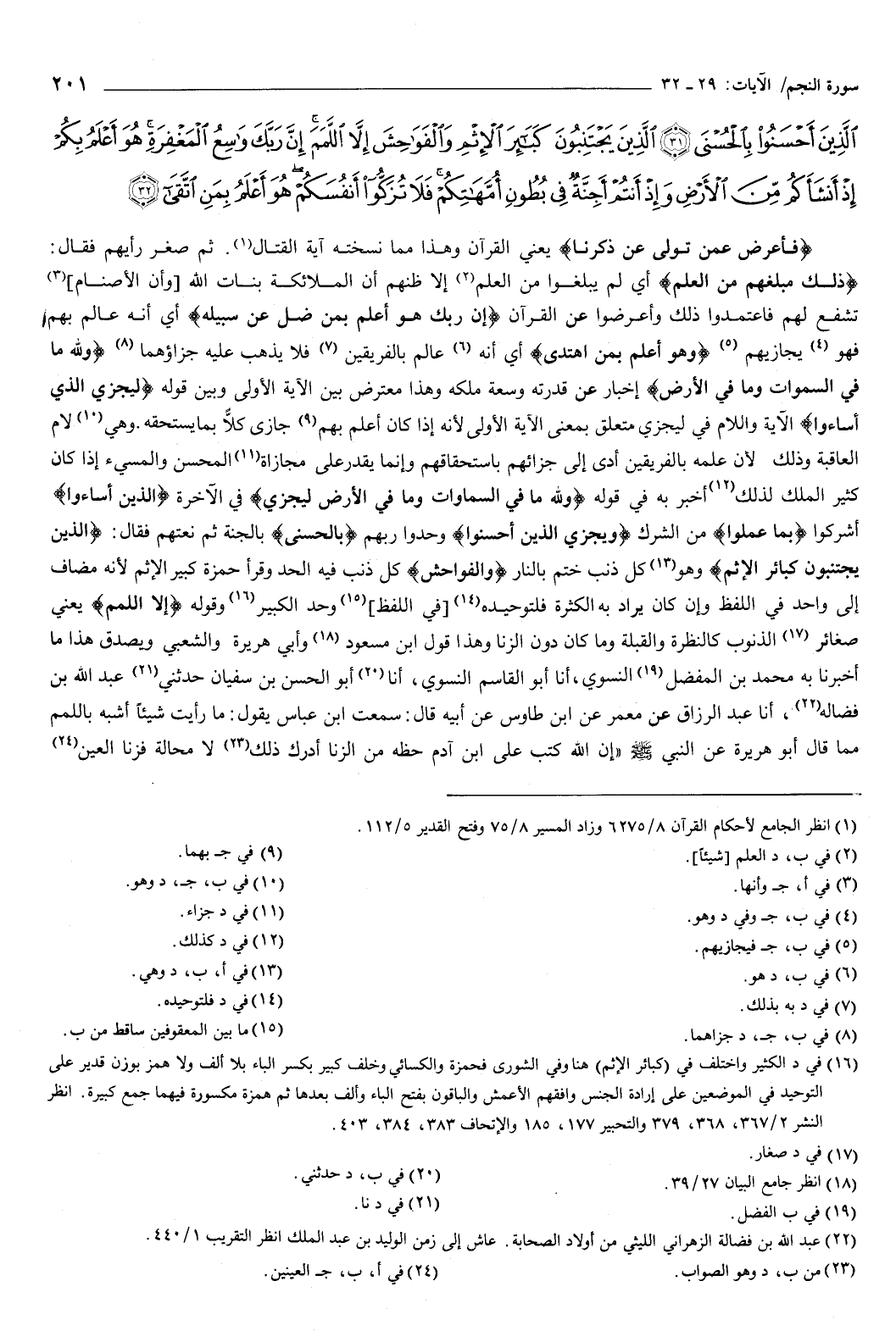 الَّذِينَ أَحْسَنُوا بِالْحُسْنَى {31} الَّذِينَ يَجْتَنِبُونَ كَبَائِرَ الإِثْمِ وَالْفَوَاحِشَ إِلا اللَّمَمَ إِنَّ رَبَّكَ وَاسِعُ الْمَغْفِرَةِ هُوَ أَعْلَمُ بِكُمْ إِذْ أَنْشَأَكُمْ مِنَ الأَرْضِ وَإِذْ أَنْتُمْ أَجِنَّةٌ فِي بُطُونِ أُمَّهَاتِكُمْ فَلا تُزَكُّوا أَنْفُسَكُمْ هُوَ أَعْلَمُ بِمَنِ اتَّقَى {32} } [النجم: 29-32] .