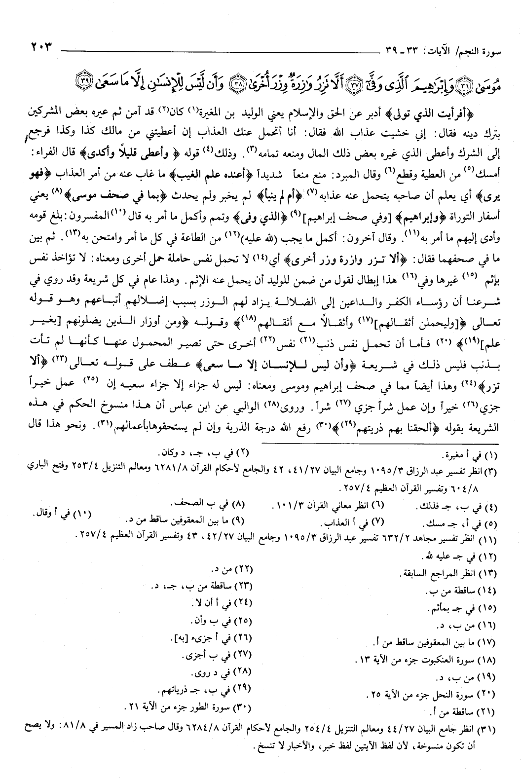 مُوسَى {36} وَإِبْرَاهِيمَ الَّذِي وَفَّى {37} أَلَّا تَزِرُ وَازِرَةٌ وِزْرَ أُخْرَى {38} وَأَنْ لَيْسَ لِلإِنْسَانِ إِلا مَا سَعَى {39} } [النجم: 33-39] .