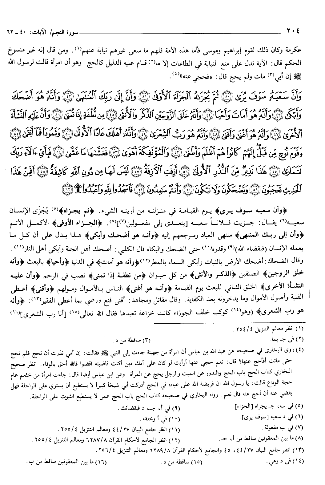 {وَأَنَّ سَعْيَهُ سَوْفَ يُرَى {40} ثُمَّ يُجْزَاهُ الْجَزَاءَ الأَوْفَى {41} وَأَنَّ إِلَى رَبِّكَ الْمُنْتَهَى {42} وَأَنَّهُ هُوَ أَضْحَكَ وَأَبْكَى {43} وَأَنَّهُ هُوَ أَمَاتَ وَأَحْيَا {44} وَأَنَّهُ خَلَقَ الزَّوْجَيْنِ الذَّكَرَ وَالأُنْثَى {45} مِنْ نُطْفَةٍ إِذَا تُمْنَى {46} وَأَنَّ عَلَيْهِ النَّشْأَةَ الأُخْرَى {47} وَأَنَّهُ هُوَ أَغْنَى وَأَقْنَى {48} وَأَنَّهُ هُوَ رَبُّ الشِّعْرَى {49} وَأَنَّهُ أَهْلَكَ عَادًا الأُولَى {50} وَثَمُودَ فَمَا أَبْقَى {51} وَقَوْمَ نُوحٍ مِنْ قَبْلُ إِنَّهُمْ كَانُوا هُمْ أَظْلَمَ وَأَطْغَى {52} وَالْمُؤْتَفِكَةَ أَهْوَى {53} فَغَشَّاهَا مَا غَشَّى {54} فَبِأَيِّ آلاءِ رَبِّكَ تَتَمَارَى {55} هَذَا نَذِيرٌ مِنَ النُّذُرِ الأُولَى {56} أَزِفَتِ الآزِفَةُ {57} لَيْسَ لَهَا مِنْ دُونِ اللَّهِ كَاشِفَةٌ {58} أَفَمِنْ هَذَا الْحَدِيثِ تَعْجَبُونَ {59} وَتَضْحَكُونَ وَلا تَبْكُونَ {60} وَأَنْتُمْ سَامِدُونَ {61} فَاسْجُدُوا لِلَّهِ وَاعْبُدُوا {62} } [النجم: 40-62] .