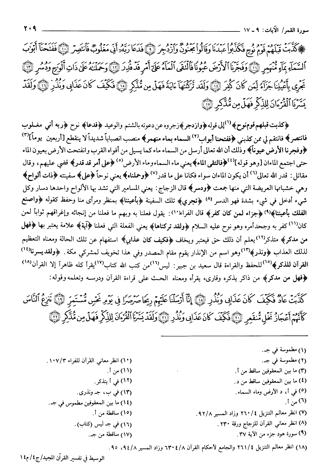 {كَذَّبَتْ قَبْلَهُمْ قَوْمُ نُوحٍ فَكَذَّبُوا عَبْدَنَا وَقَالُوا مَجْنُونٌ وَازْدُجِرَ {9} فَدَعَا رَبَّهُ أَنِّي مَغْلُوبٌ فَانْتَصِرْ {10} فَفَتَحْنَا أَبْوَابَ السَّمَاءِ بِمَاءٍ مُنْهَمِرٍ {11} وَفَجَّرْنَا الأَرْضَ عُيُونًا فَالْتَقَى الْمَاءُ عَلَى أَمْرٍ قَدْ قُدِرَ {12} وَحَمَلْنَاهُ عَلَى ذَاتِ أَلْوَاحٍ وَدُسُرٍ {13} تَجْرِي بِأَعْيُنِنَا جَزَاءً لِمَنْ كَانَ كُفِرَ {14} وَلَقَدْ تَرَكْنَاهَا آيَةً فَهَلْ مِنْ مُدَّكِرٍ {15} فَكَيْفَ كَانَ عَذَابِي وَنُذُرِ {16} وَلَقَدْ يَسَّرْنَا الْقُرْءَانَ لِلذِّكْرِ فَهَلْ مِنْ مُدَّكِرٍ {17} } [القمر: 9-17] .