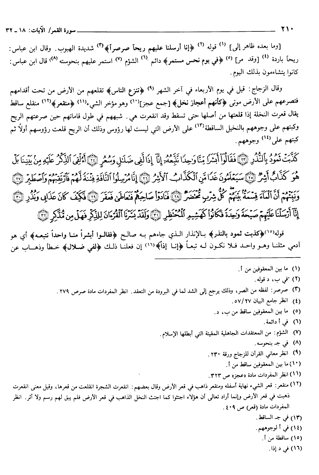 {كَذَّبَتْ ثَمُودُ بِالنُّذُرِ {23} فَقَالُوا أَبَشَرًا مِنَّا وَاحِدًا نَتَّبِعُهُ إِنَّا إِذًا لَفِي ضَلالٍ وَسُعُرٍ {24} أَؤُلْقِيَ الذِّكْرُ عَلَيْهِ مِنْ بَيْنِنَا بَلْ هُوَ كَذَّابٌ أَشِرٌ {25} سَيَعْلَمُونَ غَدًا مَنِ الْكَذَّابُ الأَشِرُ {26} إِنَّا مُرْسِلُو النَّاقَةِ فِتْنَةً لَهُمْ فَارْتَقِبْهُمْ وَاصْطَبِرْ {27} وَنَبِّئْهُمْ أَنَّ الْمَاءَ قِسْمَةٌ بَيْنَهُمْ كُلُّ شِرْبٍ مُحْتَضَرٌ {28} فَنَادَوْا صَاحِبَهُمْ فَتَعَاطَى فَعَقَرَ {29} فَكَيْفَ كَانَ عَذَابِي وَنُذُرِ {30} إِنَّا أَرْسَلْنَا عَلَيْهِمْ صَيْحَةً وَاحِدَةً فَكَانُوا كَهَشِيمِ الْمُحْتَظِرِ {31} وَلَقَدْ يَسَّرْنَا الْقُرْءَانَ لِلذِّكْرِ فَهَلْ مِنْ مُدَّكِرٍ {32} } [القمر: 23-32] .