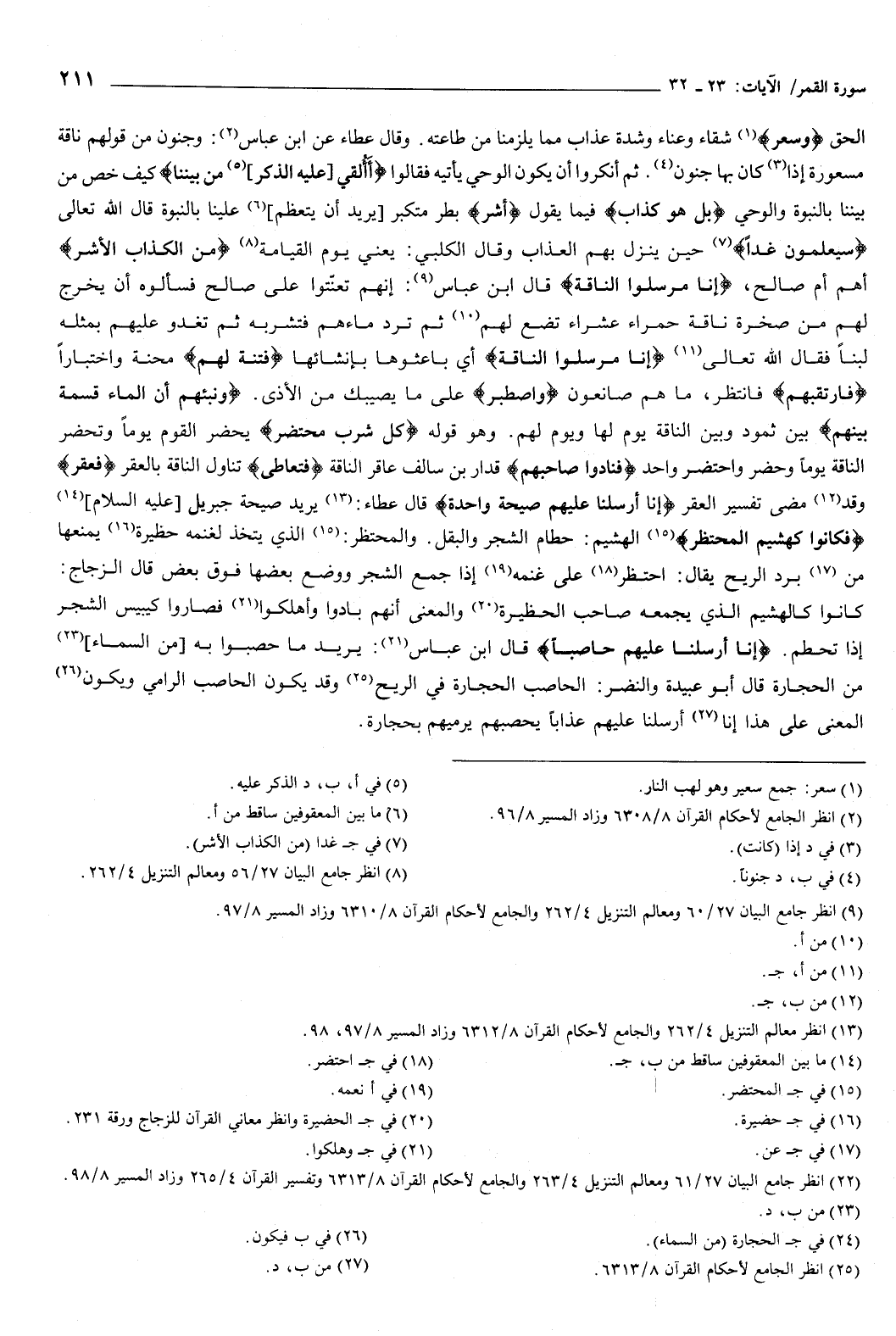 {مَنِ الْكَذَّابُ الأَشِرُ} [القمر: 26] أهم، أم صالح؟ {إِنَّا مُرْسِلُو النَّاقَةِ} [القمر: 27] قال ابن عباس: إنهم تعنتوا على صالح، فسألوه أن يخرج لهم من صخرة ناقة حمراء عشراء، تضع لهم، ثم ترد ماءهم فتشربه، ثم تغدون عليهم بمثله لبنًا.
