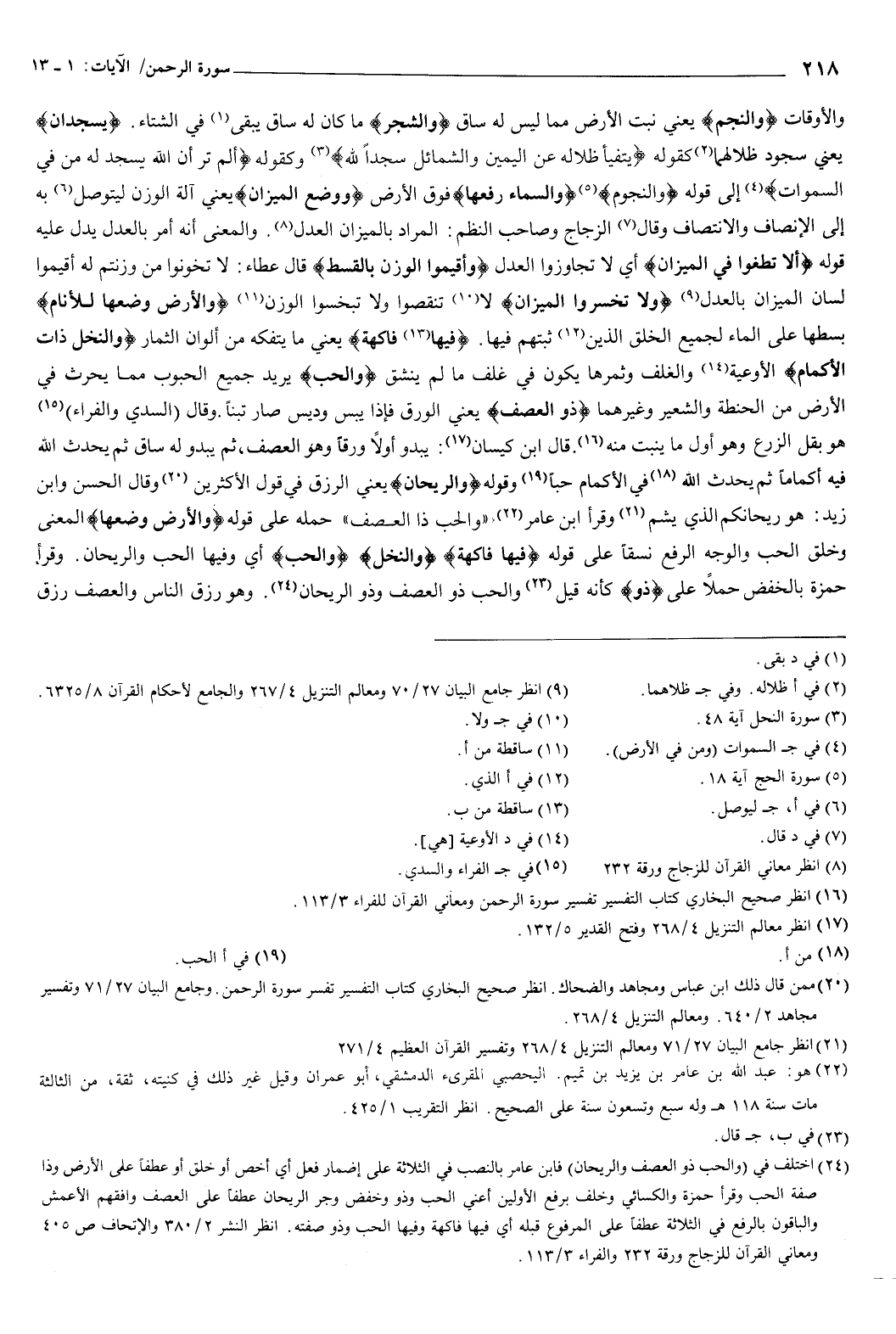 وقرأ ابن عامر: والحب ذا العصف حمله على قوله: والأرض وضعها المعنى: وخلق الحب، والوجه الرفع نسقًا على قوله: {فِيهَا فَاكِهَةٌ وَالنَّخْلُ} [الرحمن: 11] ، والحب أي: وفيها الحب والريحان، وقرأ حمزة بالخفض حملًا على ذو كأنه قيل: والحب ذو العصف وذو الريحان، وهو رزق الناس والعصف رزق