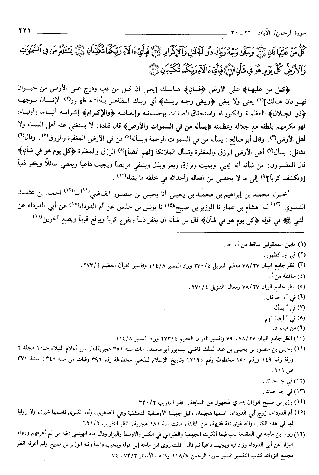 [كُلُّ مَنْ عَلَيْهَا فَانٍ {26} وَيَبْقَى وَجْهُ رَبِّكَ ذُو الْجَلالِ وَالإِكْرَامِ {27} فَبِأَيِّ آلاءِ رَبِّكُمَا تُكَذِّبَانِ {28} يَسْأَلُهُ مَنْ فِي السَّمَوَاتِ وَالأَرْضِ كُلَّ يَوْمٍ هُوَ فِي شَأْنٍ {29} فَبِأَيِّ آلاءِ رَبِّكُمَا تُكَذِّبَانِ {30} } [سورة الرحمن: 26-30] .
