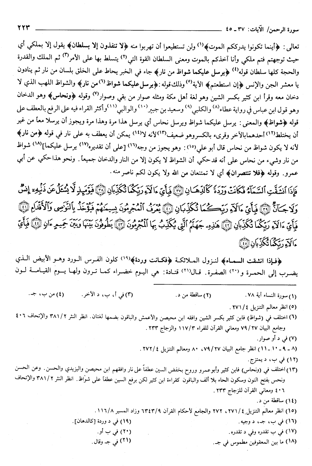 {فَإِذَا انْشَقَّتِ السَّمَاءُ فَكَانَتْ وَرْدَةً كَالدِّهَانِ {37} فَبِأَيِّ آلاءِ رَبِّكُمَا تُكَذِّبَانِ {38} فَيَوْمَئِذٍ لا يُسْأَلُ عَنْ ذَنْبِهِ إِنْسٌ وَلا جَانٌّ {39} فَبِأَيِّ آلاءِ رَبِّكُمَا تُكَذِّبَانِ {40} يُعْرَفُ الْمُجْرِمُونَ بِسِيمَاهُمْ فَيُؤْخَذُ بِالنَّوَاصِي وَالأَقْدَامِ {41} فَبِأَيِّ آلاءِ رَبِّكُمَا تُكَذِّبَانِ {42} هَذِهِ جَهَنَّمُ الَّتِي يُكَذِّبُ بِهَا الْمُجْرِمُونَ {43} يَطُوفُونَ بَيْنَهَا وَبَيْنَ حَمِيمٍ آنٍ {44} فَبِأَيِّ آلاءِ رَبِّكُمَا تُكَذِّبَانِ {45} } [الرحمن: 37-45] .