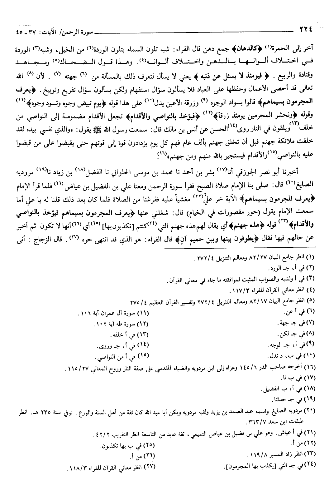 {يُعْرَفُ الْمُجْرِمُونَ بِسِيمَاهُمْ} [الرحمن: 41] قالوا: بسواد الوجوه، وزرقة الأعين، يدل على هذا قوله: {يَوْمَ تَبْيَضُّ وُجُوهٌ وَتَسْوَدُّ وُجُوهٌ} [آل عمران: 106] ، وقوله: {وَنَحْشُرُ الْمُجْرِمِينَ يَوْمَئِذٍ زُرْقًا} [طه: 102] ، {فَيُؤْخَذُ بِالنَّوَاصِي وَالأَقْدَامِ} [الرحمن: 41] تجعل الأقدام مضمومة إلى النواصي من خلف، ويلقون في النار، روى الحسن، عن أنس بن مالك، قال: سمعت رسول الله صَلَّى اللهُ عَلَيْهِ وَسَلَّمَ، يقول: «والذي نفسي بيده، لقد خلقت ملائكة جهنم قبل أن تخلق جهنم بألف عام، فهم كل يوم يزدادون قوة إلى قوتهم، حتى يقبضوا على من قبضوا عليه بالنواصي والأقدام، فيستجير بالله منهم ومن جهنم» .