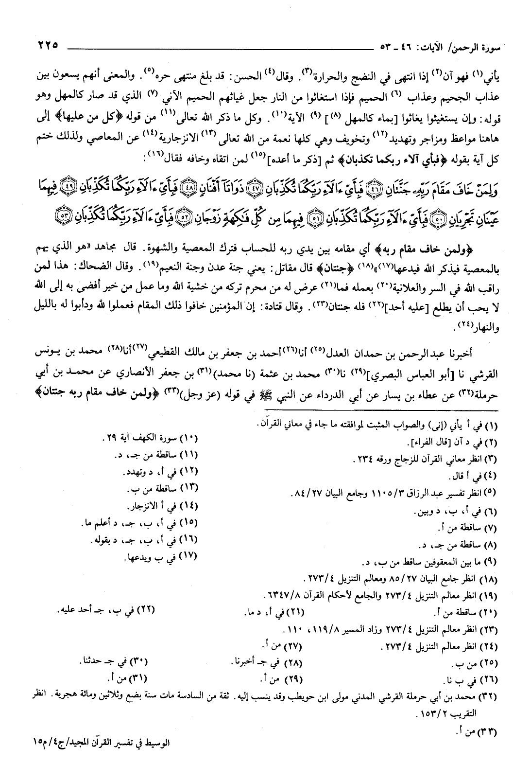 ثم ذكر ما أعده لمن اتقاه وخافه، فقال: {وَلِمَنْ خَافَ مَقَامَ رَبِّهِ جَنَّتَانِ {46} فَبِأَيِّ آلاءِ رَبِّكُمَا تُكَذِّبَانِ {47} ذَوَاتَا أَفْنَانٍ {48} فَبِأَيِّ آلاءِ رَبِّكُمَا تُكَذِّبَانِ {49} فِيهِمَا عَيْنَانِ تَجْرِيَانِ {50} فَبِأَيِّ آلاءِ رَبِّكُمَا تُكَذِّبَانِ {51} فِيهِمَا مِنْ كُلِّ فَاكِهَةٍ زَوْجَانِ {52} فَبِأَيِّ آلاءِ رَبِّكُمَا تُكَذِّبَانِ {53} } [الرحمن: 46-53] .