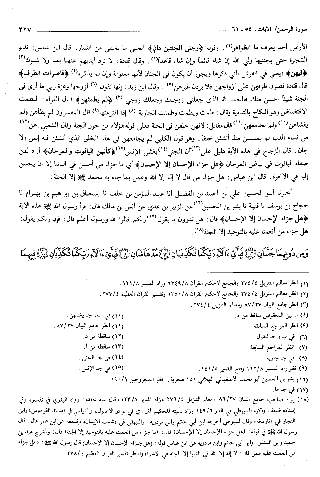 {هَلْ جَزَاءُ الإِحْسَانِ إِلا الإِحْسَانُ} [الرحمن: 60] أي: ما جزاء من أحسن في الدنيا إلا أن يحسن إليه في الآخرة، قال ابن عباس: هل جزاء من قال لا إله إلا الله، وعمل بما جاء به محمد صَلَّى اللهُ عَلَيْهِ وَسَلَّمَ، إلا الجنة.