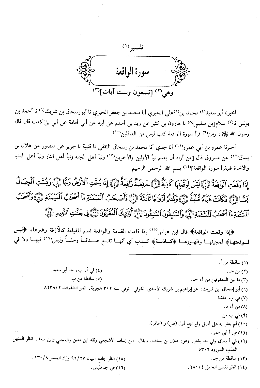 بسم الله الرحمن الرحيم] إِذَا وَقَعَتِ الْوَاقِعَةُ {1} لَيْسَ لِوَقْعَتِهَا كَاذِبَةٌ {2} خَافِضَةٌ رَافِعَةٌ {3} إِذَا رُجَّتِ الأَرْضُ رَجًّا {4} وَبُسَّتِ الْجِبَالُ بَسًّا {5} فَكَانَتْ هَبَاءً مُنْبَثًّا {6} وَكُنْتُمْ أَزْوَاجًا ثَلاثَةً {7} فَأَصْحَابُ الْمَيْمَنَةِ مَا أَصْحَابُ الْمَيْمَنَةِ {8} وَأَصْحَابُ الْمَشْأَمَةِ مَا أَصْحَابُ الْمَشْأَمَةِ {9} وَالسَّابِقُونَ السَّابِقُونَ {10} أُولَئِكَ الْمُقَرَّبُونَ {11} فِي جَنَّاتِ النَّعِيمِ {12} } [سورة الواقعة: 1-12] .