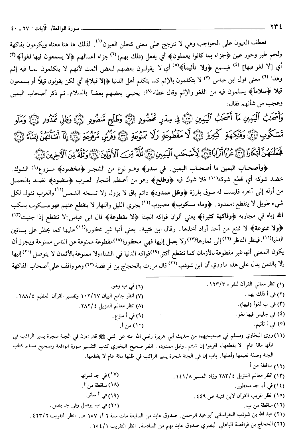 ثم ذكر أصحاب اليمين، وعجب من شأنهم، فقال: {وَأَصْحَابُ الْيَمِينِ مَا أَصْحَابُ الْيَمِينِ {27} فِي سِدْرٍ مَخْضُودٍ {28} وَطَلْحٍ مَنْضُودٍ {29} وَظِلٍّ مَمْدُودٍ {30} وَمَاءٍ مَسْكُوبٍ {31} وَفَاكِهَةٍ كَثِيرَةٍ {32} لا مَقْطُوعَةٍ وَلا مَمْنُوعَةٍ {33} وَفُرُشٍ مَرْفُوعَةٍ {34} إِنَّا أَنْشَأْنَاهُنَّ إِنْشَاءً {35} فَجَعَلْنَاهُنَّ أَبْكَارًا {36} عُرُبًا أَتْرَابًا {37} لأَصْحَابِ الْيَمِينِ {38} ثُلَّةٌ مِنَ الأَوَّلِينَ {39} وَثُلَّةٌ مِنَ الآخِرِينَ {40} } [الواقعة: 27-40] .