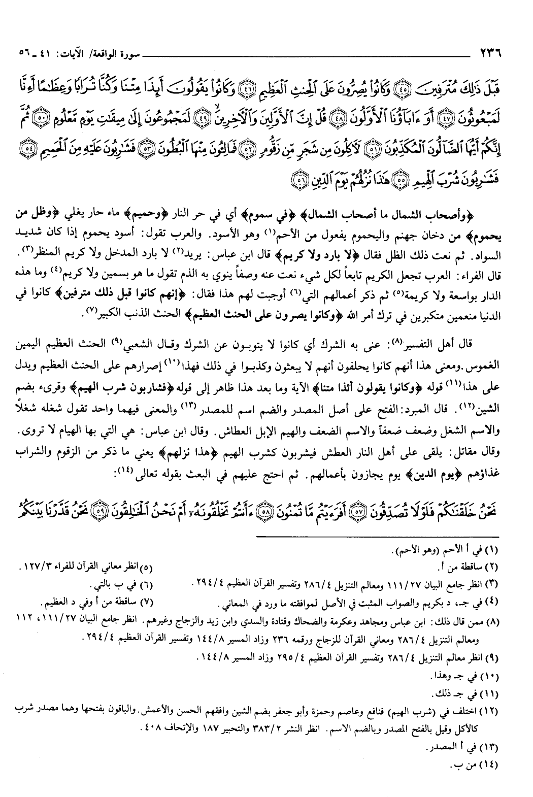 قَبْلَ ذَلِكَ مُتْرَفِينَ {45} وَكَانُوا يُصِرُّونَ عَلَى الْحِنْثِ الْعَظِيمِ {46} وَكَانُوا يَقُولُونَ أَئِذَا مِتْنَا وَكُنَّا تُرَابًا وَعِظَامًا أَئِنَّا لَمَبْعُوثُونَ {47} أَوَ آبَاؤُنَا الأَوَّلُونَ {48} قُلْ إِنَّ الأَوَّلِينَ وَالآخِرِينَ {49} لَمَجْمُوعُونَ إِلَى مِيقَاتِ يَوْمٍ مَعْلُومٍ {50} ثُمَّ إِنَّكُمْ أَيُّهَا الضَّالُّونَ الْمُكَذِّبُونَ {51} لآكِلُونَ مِنْ شَجَرٍ مِنْ زَقُّومٍ {52} فَمَالِئُونَ مِنْهَا الْبُطُونَ {53} فَشَارِبُونَ عَلَيْهِ مِنَ الْحَمِيمِ {54} فَشَارِبُونَ شُرْبَ الْهِيمِ {55} هَذَا نُزُلُهُمْ يَوْمَ الدِّينِ {56} } [الواقعة: 41-56] .