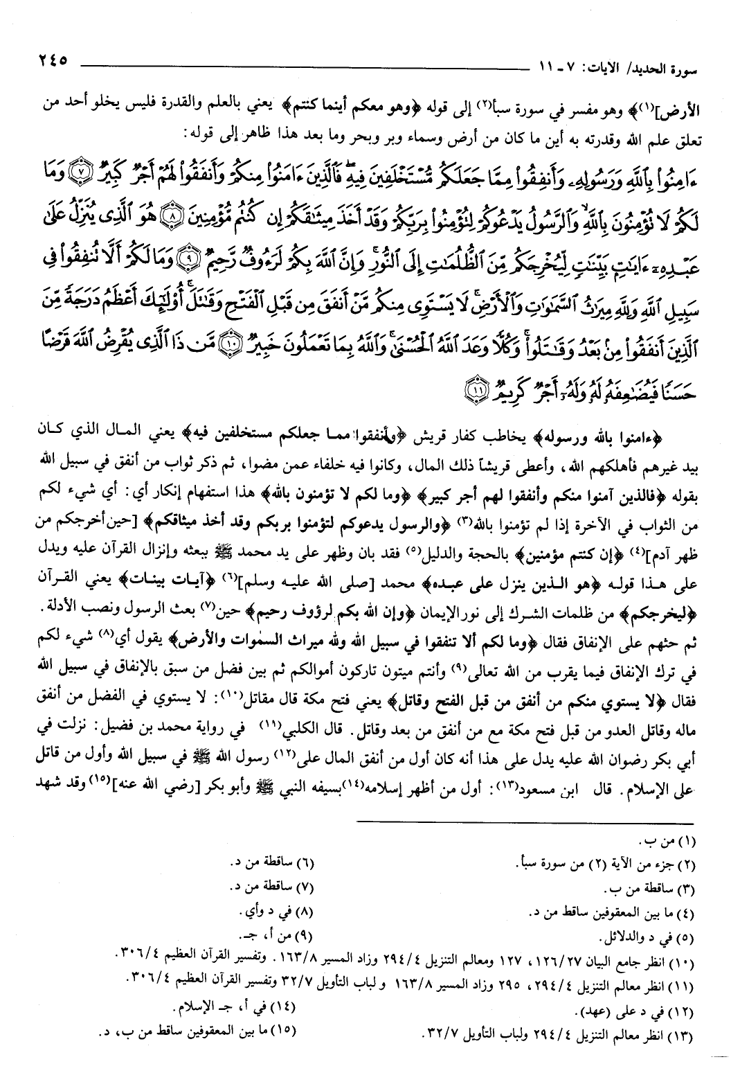 الأَرْضِ} [سورة الحديد: 4] وهو مفسر في { [سبأ، إلى قوله:] وَهُوَ مَعَكُمْ أَيْنَ مَا كُنْتُمْ} [سورة الحديد: 4] يعني: بالعلم والقدرة، فليس يخلو أحد من تعلق علم الله، وقدرته به، أين ما كان من أرض، وسماء، وبر، وبحر، وما بعد هذا ظاهر إلى قوله: {آمِنُوا بِاللَّهِ وَرَسُولِهِ وَأَنْفِقُوا مِمَّا جَعَلَكُمْ مُسْتَخْلَفِينَ فِيهِ فَالَّذِينَ آمَنُوا مِنْكُمْ وَأَنْفَقُوا لَهُمْ أَجْرٌ كَبِيرٌ {7} وَمَا لَكُمْ لا تُؤْمِنُونَ بِاللَّهِ وَالرَّسُولُ يَدْعُوكُمْ لِتُؤْمِنُوا بِرَبِّكُمْ وَقَدْ أَخَذَ مِيثَاقَكُمْ إِنْ كُنْتُمْ مُؤْمِنِينَ {8} هُوَ الَّذِي يُنَزِّلُ عَلَى عَبْدِهِ آيَاتٍ بَيِّنَاتٍ لِيُخْرِجَكُمْ مِنَ الظُّلُمَاتِ إِلَى النُّورِ وَإِنَّ اللَّهَ بِكُمْ لَرَءُوفٌ رَحِيمٌ {9} وَمَا لَكُمْ أَلَّا تُنْفِقُوا فِي سَبِيلِ اللَّهِ وَلِلَّهِ مِيرَاثُ السَّمَوَاتِ وَالأَرْضِ لا يَسْتَوِي مِنْكُمْ مَنْ أَنْفَقَ مِنْ قَبْلِ الْفَتْحِ وَقَاتَلَ أُولَئِكَ أَعْظَمُ دَرَجَةً مِنَ الَّذِينَ أَنْفَقُوا مِنْ بَعْدُ وَقَاتَلُوا وَكُلًّا وَعَدَ اللَّهُ الْحُسْنَى وَاللَّهُ بِمَا تَعْمَلُونَ خَبِيرٌ {10} مَنْ ذَا الَّذِي يُقْرِضُ اللَّهَ قَرْضًا حَسَنًا فَيُضَاعِفَهُ لَهُ وَلَهُ أَجْرٌ كَرِيمٌ {11} } [الحديد: 7-11] .