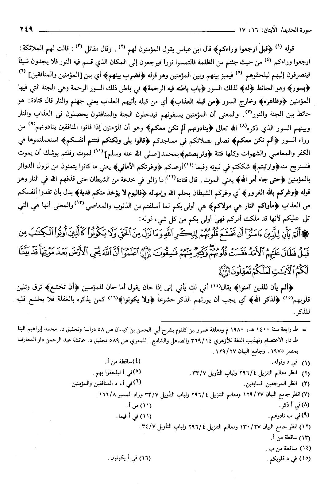 قوله: {أَلَمْ يَأْنِ لِلَّذِينَ آمَنُوا أَنْ تَخْشَعَ قُلُوبُهُمْ لِذِكْرِ اللَّهِ وَمَا نَزَلَ مِنَ الْحَقِّ وَلا يَكُونُوا كَالَّذِينَ أُوتُوا الْكِتَابَ مِنْ قَبْلُ فَطَالَ عَلَيْهِمُ الأَمَدُ فَقَسَتْ قُلُوبُهُمْ وَكَثِيرٌ مِنْهُمْ فَاسِقُونَ {16} اعْلَمُوا أَنَّ اللَّهَ يُحْيِي الأَرْضَ بَعْدَ مَوْتِهَا قَدْ بَيَّنَّا لَكُمُ الآيَاتِ لَعَلَّكُمْ تَعْقِلُونَ {17} } [الحديد: 16-17] .