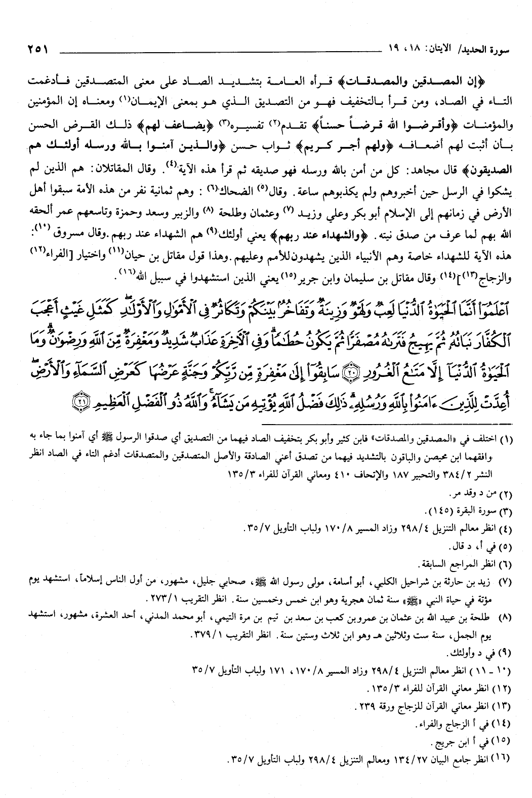 {إِنَّ الْمُصَّدِّقِينَ وَالْمُصَّدِّقَاتِ} [الحديد: 18] قرأه العامة بتشديد الصاد، على معنى: المتصدقين، فأدغمت التاء في الصاد، ومن قرأ بالتخفيف فهو من التصديق الذي هو بمعنى: الإيمان، ومعناه: إن المؤمنين والمؤمنات، {وَأَقْرَضُوا اللَّهَ قَرْضًا حَسَنًا} [الحديد: 18] تقدم تفسيره، يضاعف لهم ذلك القرض الحسن، بأن أثبت لهم أضعافه، {وَلَهُمْ أَجْرٌ كَرِيمٌ} [الحديد: 18] ثواب حسن.
