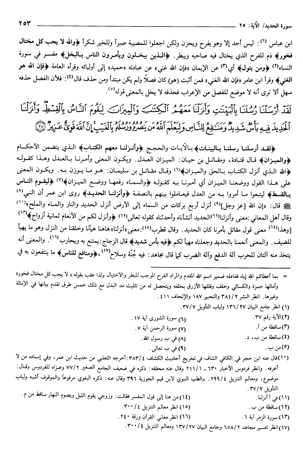{لَقَدْ أَرْسَلْنَا رُسُلَنَا بِالْبَيِّنَاتِ} [الحديد: 25] بالآيات والحجج، {وَأَنْزَلْنَا مَعَهُمُ الْكِتَابَ} [الحديد: 25] الذي يتضمن الأحكام، والميزان قال قتادة، ومقاتل بن حيان: الميزان العدل.