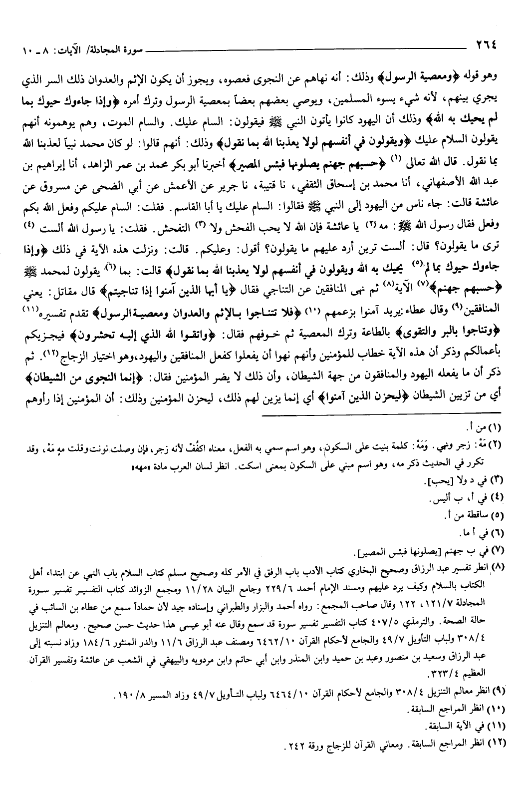 1175 - أَخْبَرَنَا أَبُو بَكْرٍ مُحَمَّدُ بْنُ عُمَرَ الزَّاهِدُ، أنا إِبْرَاهِيمُ بْنُ عَبْدِ اللَّهِ الأَصْفَهَانِيُّ، أنا مُحَمَّدُ بْنُ إِسْحَاقَ الثَّقَفِيُّ، نا قُتَيْبَةُ، نا جَرِيرٌ، عَنِ الأَعْمَشِ، عَنْ أَبِي الضُّحَى، عَنْ مَسْرُوقٍ، عَنْ عَائِشَةَ، قَالَتْ: جَاءَ نَاسٌ مِنَ الْيَهُودِ إِلَى النَّبِيِّ صَلَّى اللهُ عَلَيْهِ وَسَلَّمَ، فَقَالُوا: السَّامُ عَلَيْكَ يَا أَبَا الْقَاسِمِ، فَقُلْتُ: السَّامُ عَلَيْكُمْ وَفَعَلَ اللَّهُ بِكُمْ وَفَعَلَ، فَقَالَ رَسُولُ اللَّهِ صَلَّى اللهُ عَلَيْهِ وَسَلَّمَ: مَهْ يَا عَائِشَةُ، فَإِنَّ اللَّهَ لا يُحِبُّ الْفُحْشَ وَلا التَّفَحُّشَ، فَقُلْتُ: يَا رَسُولَ اللَّهِ، أَلَسْتَ تَرَى مَا يَقُولُونَ؟ قَالَ: أَلَسْتِ تَرَيْنَ أَرُدُّ عَلَيْهِمْ مَا يَقُولُونَ؟ أَقُولُ: وَعَلَيْكُمْ، قَالَتْ: وَنَزَلَتْ هَذِهِ الآيَةُ فِي ذَلِكَ {وَإِذَا جَاءُوكَ حَيَّوْكَ بِمَا لَمْ يُحَيِّكَ بِهِ اللَّهُ وَيَقُولُونَ فِي أَنْفُسِهِمْ لَوْلا يُعَذِّبُنَا اللَّهُ بِمَا نَقُولُ} [المجادلة: 8] قَالَتْ: بِمَا يَقُولُونَ لِمُحَمَّدٍ صَلَّى اللهُ عَلَيْهِ وَسَلَّمَ {حَسْبُهُمْ جَهَنَّمُ} [المجادلة: 8] الآية