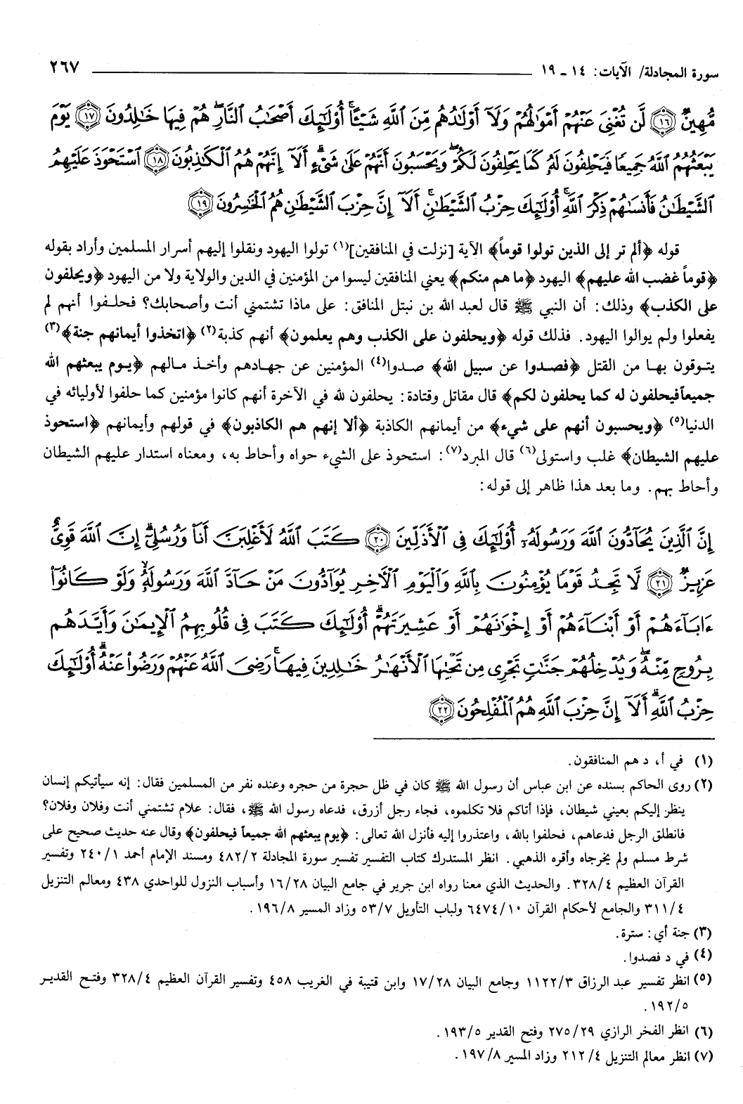 وما بعد هذا ظاهر إلى قوله: {إِنَّ الَّذِينَ يُحَادُّونَ اللَّهَ وَرَسُولَهُ أُولَئِكَ فِي الأَذَلِّينَ {20} كَتَبَ اللَّهُ لأَغْلِبَنَّ أَنَا وَرُسُلِي إِنَّ اللَّهَ قَوِيٌّ عَزِيزٌ {21} لا تَجِدُ قَوْمًا يُؤْمِنُونَ بِاللَّهِ وَالْيَوْمِ الآخِرِ يُوَادُّونَ مَنْ حَادَّ اللَّهَ وَرَسُولَهُ وَلَوْ كَانُوا آبَاءَهُمْ أَوْ أَبْنَاءَهُمْ أَوْ إِخْوَانَهُمْ أَوْ عَشِيرَتَهُمْ أُولَئِكَ كَتَبَ فِي قُلُوبِهِمُ الإِيمَانَ وَأَيَّدَهُمْ بِرُوحٍ مِنْهُ وَيُدْخِلُهُمْ جَنَّاتٍ تَجْرِي مِنْ تَحْتِهَا الأَنْهَارُ خَالِدِينَ فِيهَا رَضِيَ اللَّهُ عَنْهُمْ وَرَضُوا عَنْهُ أُولَئِكَ حِزْبُ اللَّهِ أَلا إِنَّ حِزْبَ اللَّهِ هُمُ الْمُفْلِحُونَ {22} } [المجادلة: 20-22] .