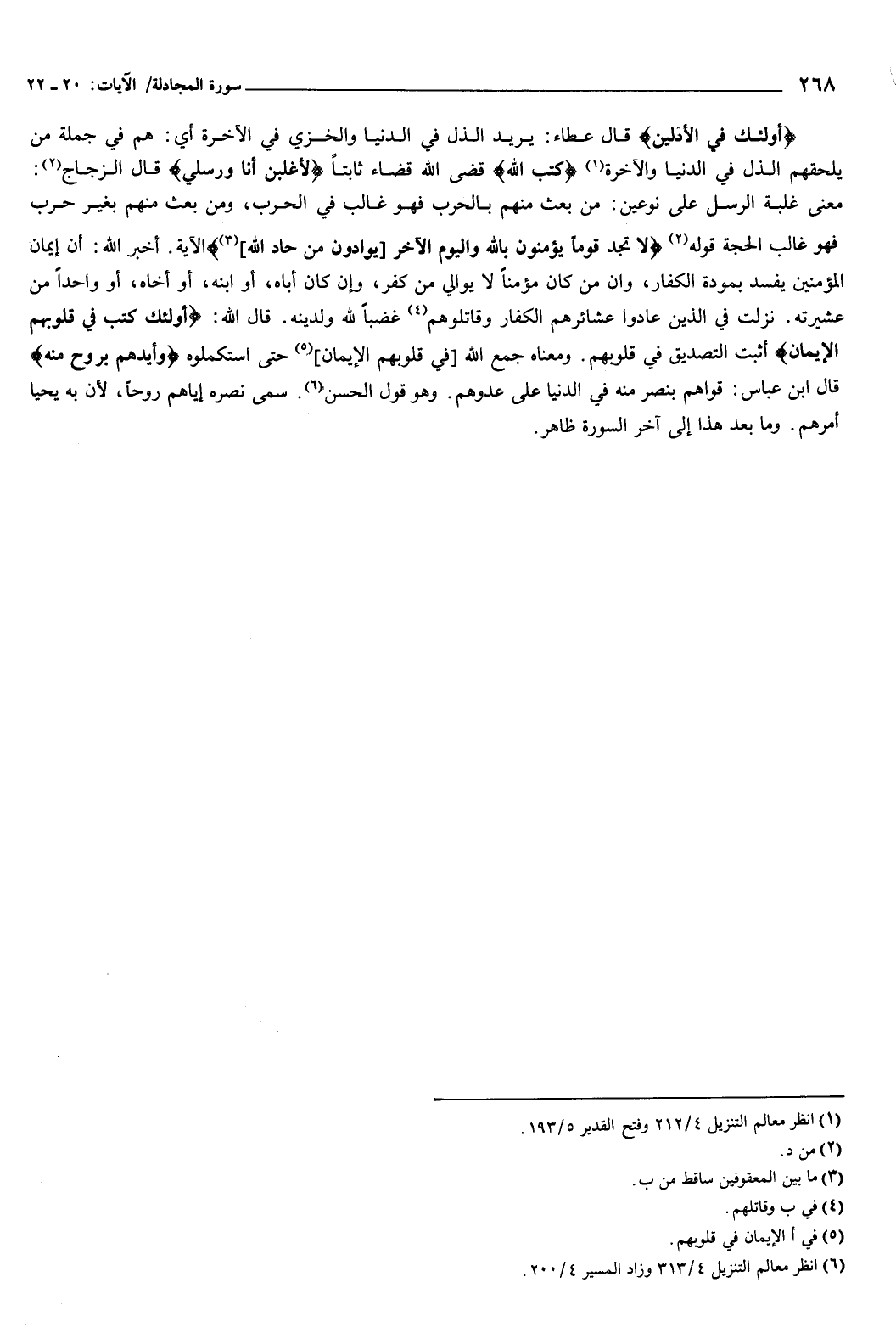 قوله: {لا تَجِدُ قَوْمًا يُؤْمِنُونَ بِاللَّهِ وَالْيَوْمِ الآخِرِ يُوَادُّونَ مَنْ حَادَّ اللَّهَ} [المجادلة: 22] الآية، أخبر الله: أن إيمان المؤمنين يفسد بمودة الكفار، وإن من كان مؤمنًا لا يوالي من كفر، وإن كان أباه، أو ابنه، أو أخاه، أو واحدًا من عشيرته، نزلت في الذين عادوا عشائرهم الكفار وقاتلوهم، غضبًا لله ولدينه، قال الله: {أُولَئِكَ كَتَبَ فِي قُلُوبِهِمُ الإِيمَانَ} [المجادلة: 22] أثبت التصديق في قلوبهم، ومعناه: جمع الله في قلوبهم الإيمان حتى استكملوه، {وَأَيَّدَهُمْ بِرُوحٍ مِنْهُ} [المجادلة: 22] قال ابن عباس: قواهم بنصر منه في الدنيا على عدوهم.