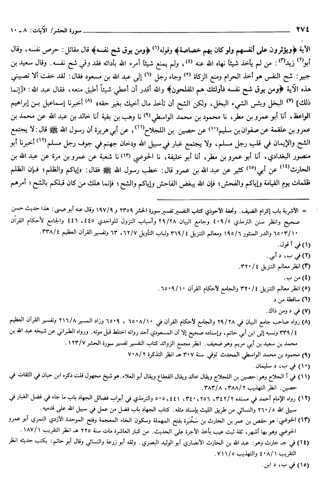 وجاء رجل إلى عبد الله بن مسعود، فقال: لقد خفت ألا تصيبني هذه الآية: {وَمَنْ يُوقَ شُحَّ نَفْسِهِ فَأُولَئِكَ هُمُ الْمُفْلِحُونَ} [الحشر: 9] والله أقدر أن أعطي شيئًا أطيق منعه.