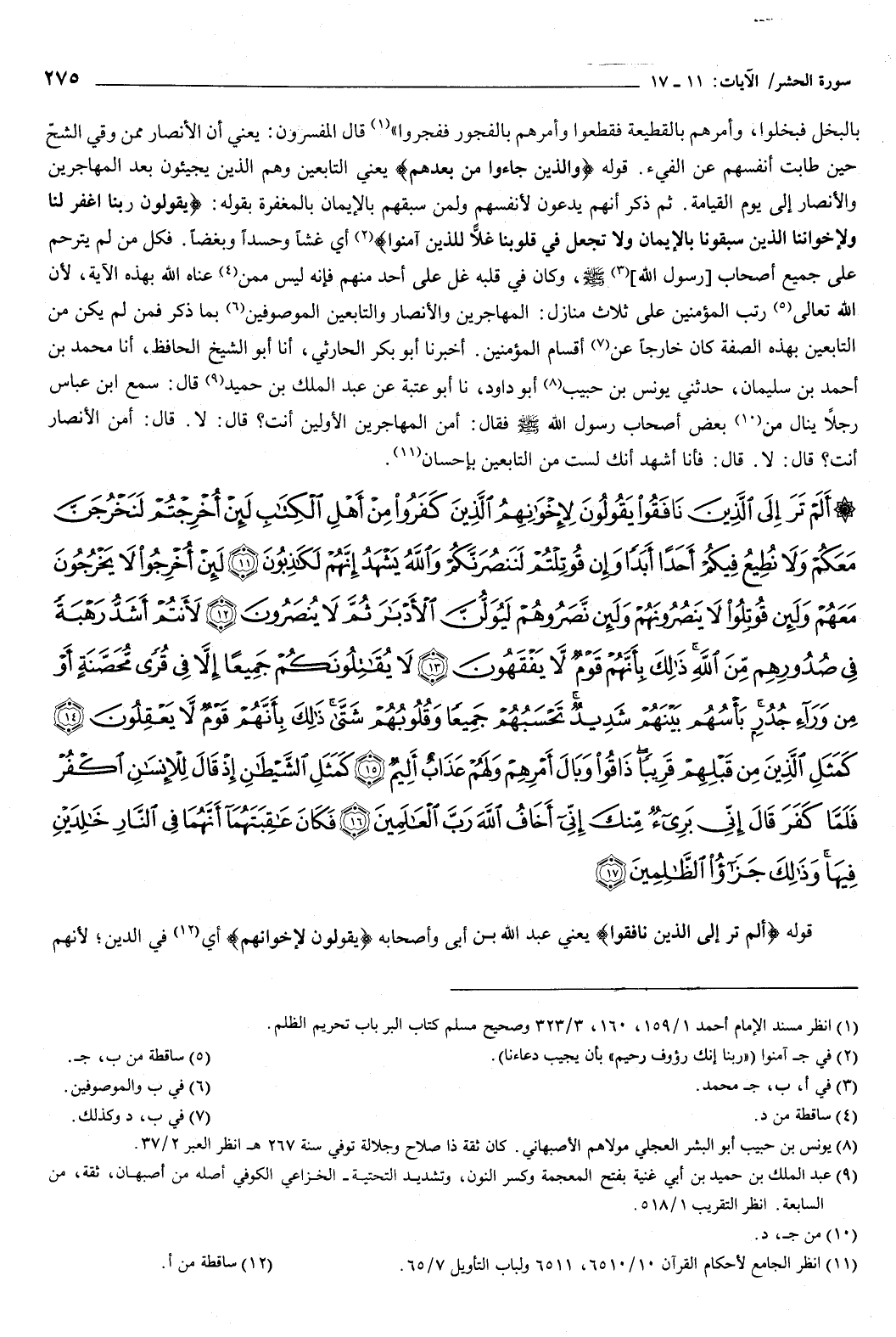 {أَلَمْ تَرَ إِلَى الَّذِينَ نَافَقُوا يَقُولُونَ لإِخْوَانِهِمُ الَّذِينَ كَفَرُوا مِنْ أَهْلِ الْكِتَابِ لَئِنْ أُخْرِجْتُمْ لَنَخْرُجَنَّ مَعَكُمْ وَلا نُطِيعُ فِيكُمْ أَحَدًا أَبَدًا وَإِنْ قُوتِلْتُمْ لَنَنْصُرَنَّكُمْ وَاللَّهُ يَشْهَدُ إِنَّهُمْ لَكَاذِبُونَ {11} لَئِنْ أُخْرِجُوا لا يَخْرُجُونَ مَعَهُمْ وَلَئِنْ قُوتِلُوا لا يَنْصُرُونَهُمْ وَلَئِنْ نَصَرُوهُمْ لَيُوَلُّنَّ الأَدْبَارَ ثُمَّ لا يُنْصَرُونَ {12} لأَنْتُمْ أَشَدُّ رَهْبَةً فِي صُدُورِهِمْ مِنَ اللَّهِ ذَلِكَ بِأَنَّهُمْ قَوْمٌ لا يَفْقَهُونَ {13} لا يُقَاتِلُونَكُمْ جَمِيعًا إِلا فِي قُرًى مُحَصَّنَةٍ أَوْ مِنْ وَرَاءِ جُدُرٍ بَأْسُهُمْ بَيْنَهُمْ شَدِيدٌ تَحْسَبُهُمْ جَمِيعًا وَقُلُوبُهُمْ شَتَّى ذَلِكَ بِأَنَّهُمْ قَوْمٌ لا يَعْقِلُونَ {14} كَمَثَلِ الَّذِينَ مِنْ قَبْلِهِمْ قَرِيبًا ذَاقُوا وَبَالَ أَمْرِهِمْ وَلَهُمْ عَذَابٌ أَلِيمٌ {15} كَمَثَلِ الشَّيْطَانِ إِذْ قَالَ لِلإِنْسَانِ اكْفُرْ فَلَمَّا كَفَرَ قَالَ إِنِّي بَرِيءٌ مِنْكَ إِنِّي أَخَافُ اللَّهَ رَبَّ الْعَالَمِينَ {16} فَكَانَ عَاقِبَتَهُمَا أَنَّهُمَا فِي النَّارِ خَالِدَيْنِ فِيهَا وَذَلِكَ جَزَاءُ الظَّالِمِينَ {17} } [الحشر: 11-17] .