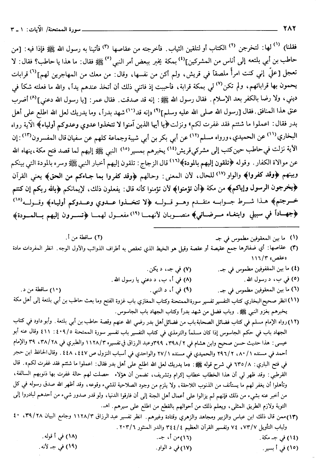 فَقُلْنَا لَهَا: لَتُخْرِجِنَّ الْكِتَابَ أَوْ لَتُلْقِيَنَّ الثِّيَابَ، فَأَخْرَجَتْهُ مِنْ عِقَاصِهَا، فَأَتَيْنَا بِهِ رَسُولَ اللَّهِ صَلَّى اللهُ عَلَيْهِ وَسَلَّمَ، فَإِذَا فِيهِ: مِنْ حَاطِبِ بْنِ أَبِي بَلْتَعَةَ إِلَى أُنَاسٍ مِنَ الْمُشْرِكِينَ بِمَكَّةَ يُخْبِرُ بِبَعْضِ أَمْرِ النَّبِيِّ صَلَّى اللهُ عَلَيْهِ وَسَلَّمَ، فَقَالَ: مَا هَذَا يَا حَاطِبُ؟ فَقَالَ: لا تَعْجَلْ عَلَيَّ إِنِّي كُنْتُ امْرَأً مُلْصَقًا فِي قُرَيْشٍ، وَلَمْ أَكُنْ مِنْ نَفْسِهَا، وَقَالَ: مَنْ مَعَكَ مِنَ الْمُهَاجِرِينَ لَهُمْ قَرَابَاتٌ يَحْمُونَ بِهَا قَرَابَاتِهِمْ، وَلَمْ تَكُنْ لِي بِمَكَّةَ قَرَابَةٌ، فَأَحْبَبْتُ إِذْ فَاتَنِي ذَلِكَ أَنْ أَتَّخِذَ عِنْدَهُمْ يَدًا، وَاللَّهِ مَا فَعَلْتُهُ شَكًّا فِي دِينِي، وَلا رِضًا بِالْكُفْرِ بَعْدَ الْإِسْلامِ، فَقَالَ رَسُولُ اللَّهِ صَلَّى اللهُ عَلَيْهِ وَسَلَّمَ: إِنَّهُ قَدْ صَدَقْتَ، فَقَالَ عُمَرُ: يَا رَسُولَ اللَّهِ، دَعْنِي أَضْرِبْ عُنُقَ هَذَا الْمُنَافِقِ، فَقَالَ رَسُولُ اللَّهِ صَلَّى اللهُ عَلَيْهِ وَسَلَّمَ: " إِنَّهُ قَدْ شَهِدَ بَدْرًا، وَمَا يُدْرِيكَ لَعَلَّ اللَّهَ اطَّلَعَ عَلَى أَهْلِ بَدْرٍ، فَقَالَ: اعْمَلُوا مَا شِئْتُمْ فَقَدْ غَفَرْتُ لَكُمْ " وَنَزَلَتْ {يَأَيُّهَا الَّذِينَ آمَنُوا لا تَتَّخِذُوا عَدُوِّي وَعَدُوَّكُمْ أَوْلِيَاءَ} [الممتحنة: 1] الآية رَوَاهُ الْبُخَارِيّ، عَنِ الْحُمَيْدِيّ، وَرَوَاه مُسْلِم، عَنْ أَبِي بَكْرِ بْنِ أَبِي شَيْبَةَ، وَجَمَاعَةٌ كُلُّهُمْ عَنْ سُفْيَان