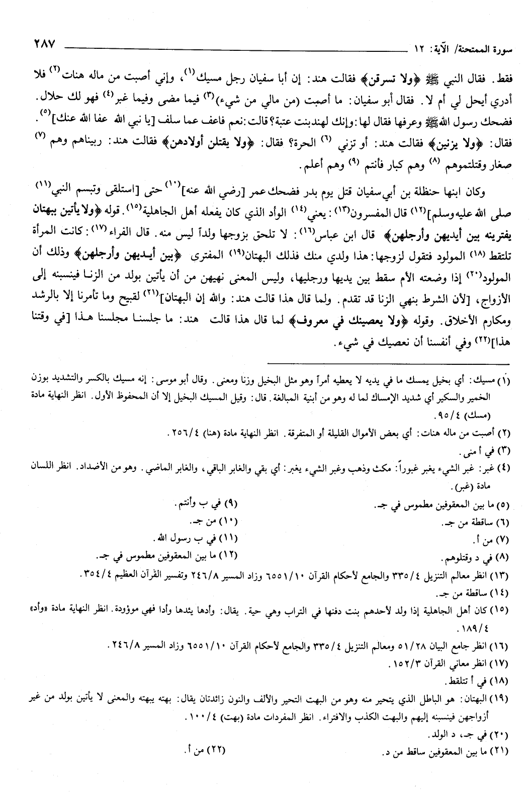{بَيْنَ أَيْدِيهِنَّ وَأَرْجُلِهِنَّ} [الممتحنة: 12] وذلك أن المولود إذا وضعته الأم، سقط بين يديها ورجليها، وليس المعنى نهيهن من أن يأتين بولد من الزنا، فينسبنه على الأزواج، لأن الشرط بنهي الزنا قد تقدم، ولما قال هذا، قالت هند: والله إن البهتان لقبيح، وما تأمرنا إلا بالرشد ومكارم الأخلاق.