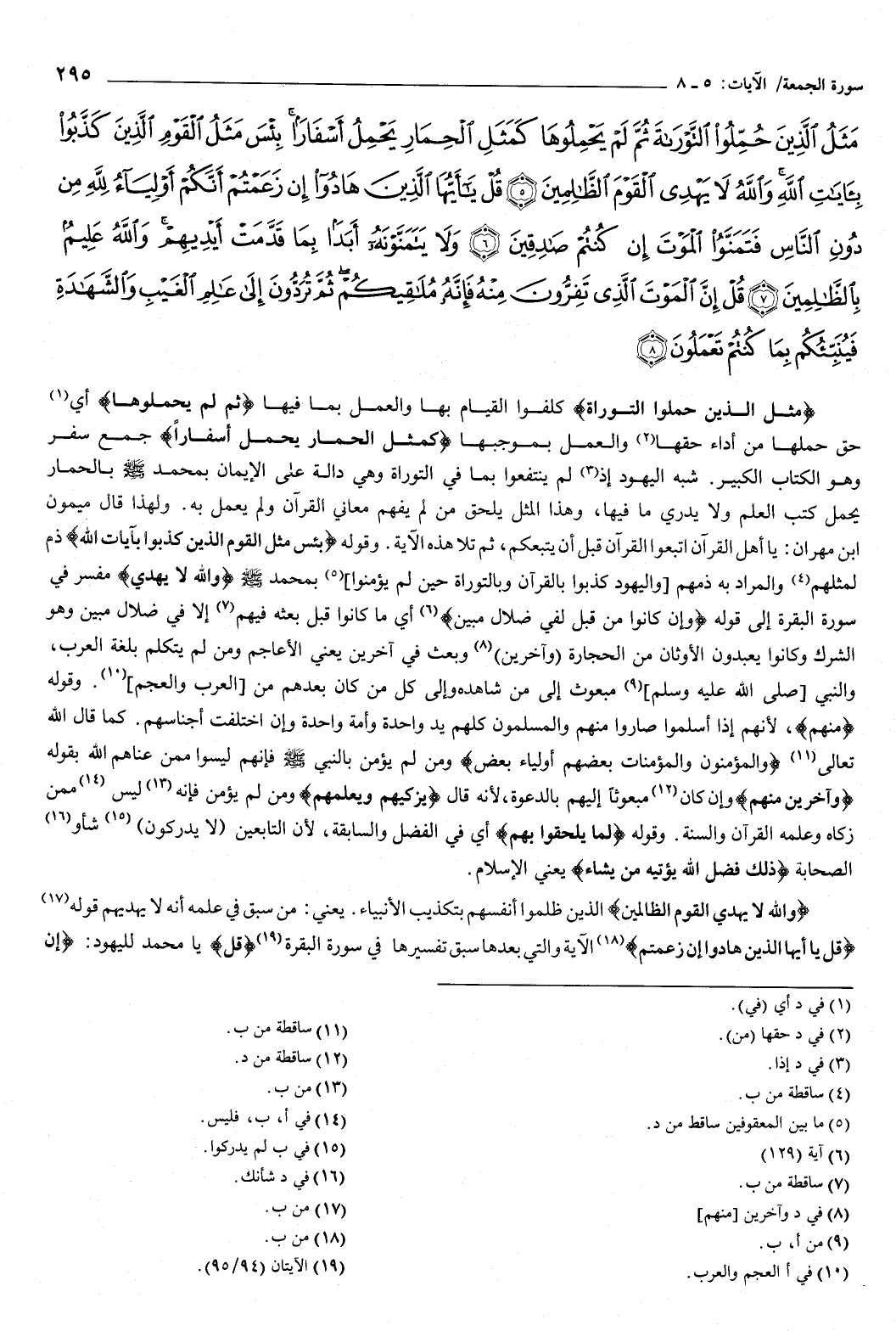 {مَثَلُ الَّذِينَ حُمِّلُوا التَّوْرَاةَ ثُمَّ لَمْ يَحْمِلُوهَا كَمَثَلِ الْحِمَارِ يَحْمِلُ أَسْفَارًا بِئْسَ مَثَلُ الْقَوْمِ الَّذِينَ كَذَّبُوا بِآيَاتِ اللَّهِ وَاللَّهُ لا يَهْدِي الْقَوْمَ الظَّالِمِينَ {5} قُلْ يَأَيُّهَا الَّذِينَ هَادُوا إِنْ زَعَمْتُمْ أَنَّكُمْ أَوْلِيَاءُ لِلَّهِ مِنْ دُونِ النَّاسِ فَتَمَنَّوُا الْمَوْتَ إِنْ كُنْتُمْ صَادِقِينَ {6} وَلا يَتَمَنَّوْنَهُ أَبَدًا بِمَا قَدَّمَتْ أَيْدِيهِمْ وَاللَّهُ عَلِيمٌ بِالظَّالِمِينَ {7} قُلْ إِنَّ الْمَوْتَ الَّذِي تَفِرُّونَ مِنْهُ فَإِنَّهُ مُلاقِيكُمْ ثُمَّ تُرَدُّونَ إِلَى عَالِمِ الْغَيْبِ وَالشَّهَادَةِ فَيُنَبِّئُكُمْ بِمَا كُنْتُمْ تَعْمَلُونَ {8} } [الجمعة: 5-8] .